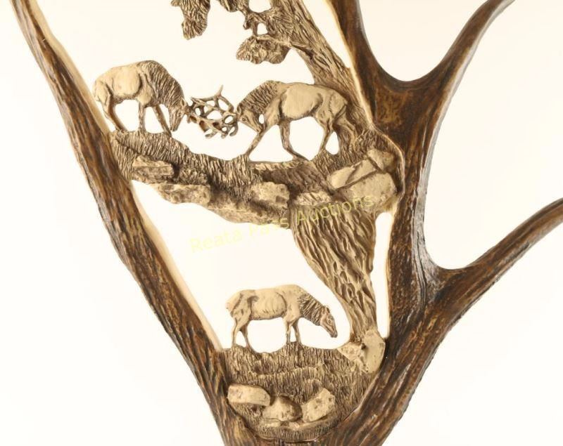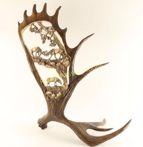 Quality made synthetic moose antler with ornate incised fighting elk scene. Measures 22" x 15" x 24". In excellent condition. Perfect for the cabin or trophy room.