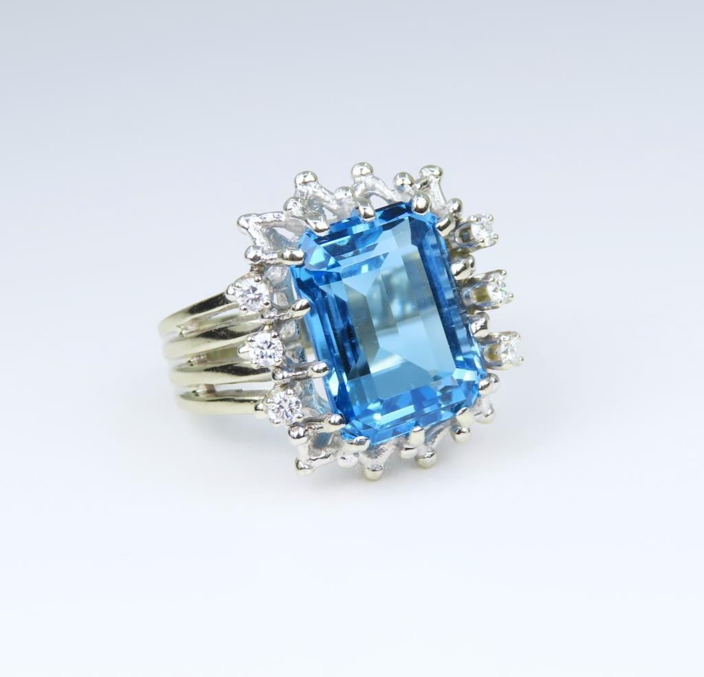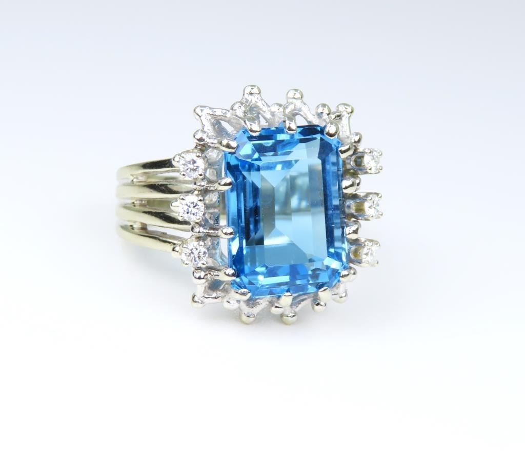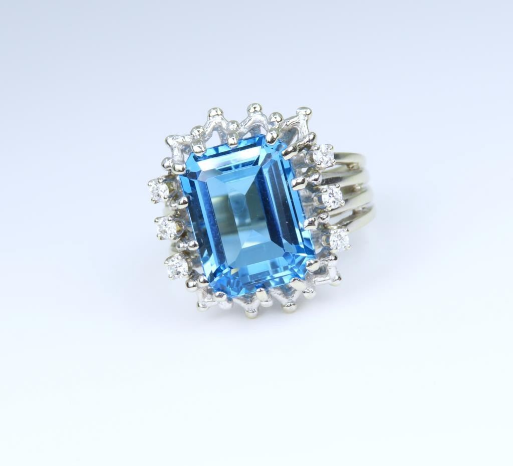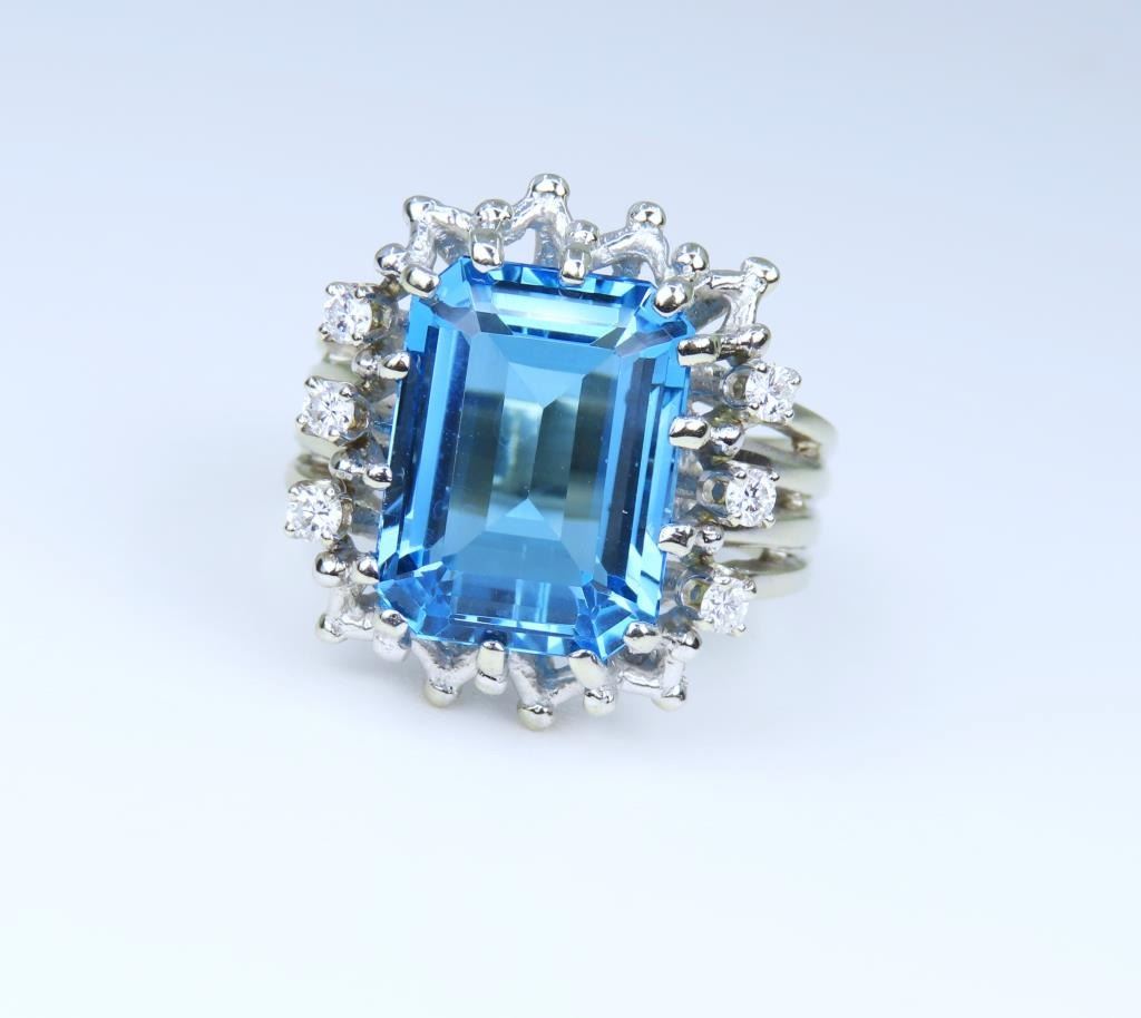 Ring, featuring an emerald cut Blue Topaz weighing approx. 10.00 carats, accented with 6 round cut side Diamonds set in a 14 karat white gold setting, ring size 8.