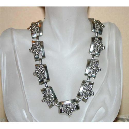 A fabulous antique Nickle Silver Retro Modern Era Flower Basket Link Necklace. Slightly dome shaped with each link measuring 1 inch long by 3/4 inch wide and 16 inches long, attaching with a C hook closure. This wonderful vintage necklace is quite weighty and very well made.