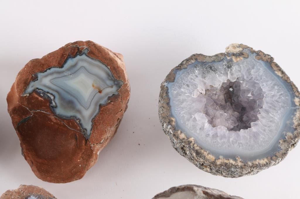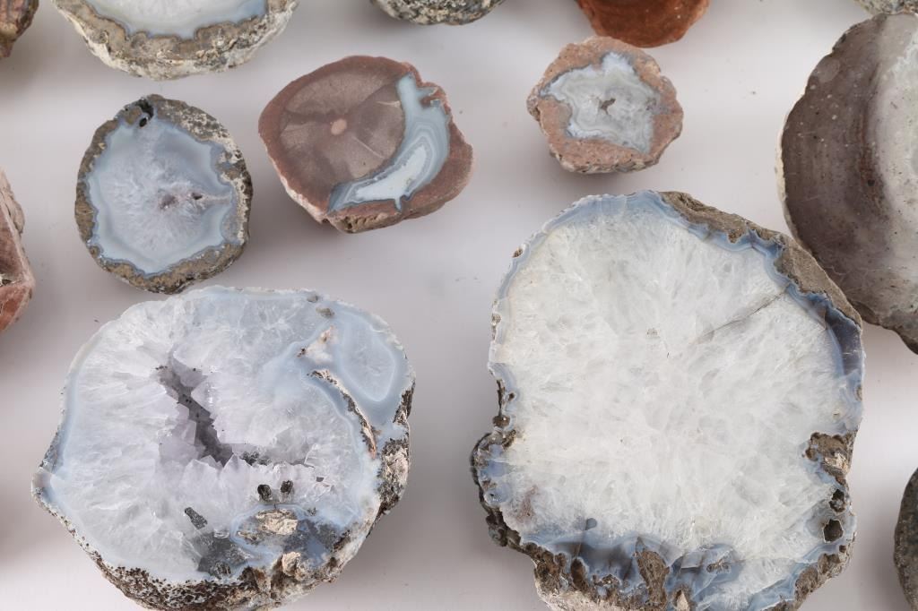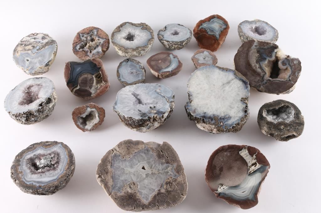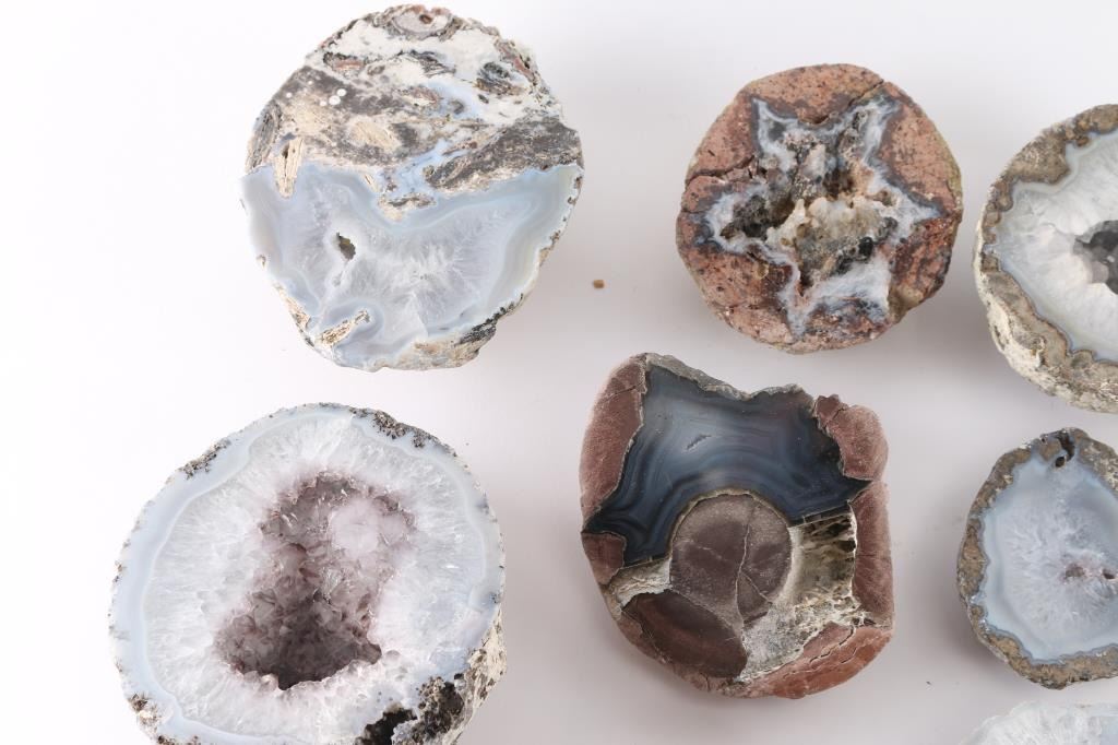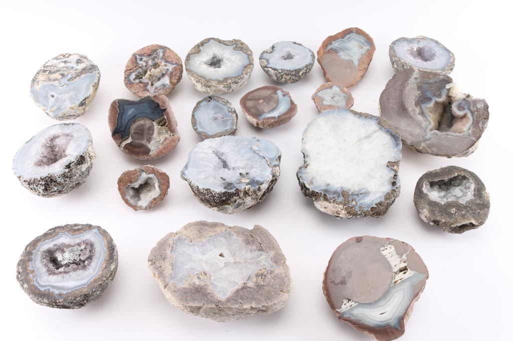 Geodes are rocks that have magical minerals and crystals inside their cavities. This lot of 19 is an excellent selection of beautiful cut and polished geodes in a variety of sizes, including a few rare agate-filled nodules known as "thundereggs".