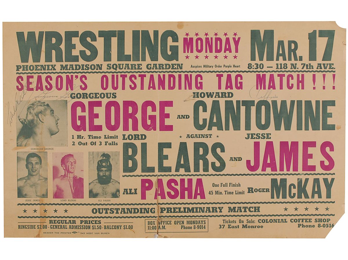Professional wrestler, real name George Raymond Wagner, (1915–1963), who gained mainstream popularity and became one of the biggest stars of the Golden Age of Wrestling. Original vintage broadside for a wrestling card at the Phoenix Madison Square Garden, 22 x 14, with the main event being a two out of three falls tag team match of Gorgeous George and Howard Cantowine against Lord Blears and Jesse James. Signed in blue ink above his image, “Gorgeous George,” and also signed by Lord Blears and one other. Partial separation along a vertical fold left of center, two missing corner tips, dampstaining to left side, a few small holes and dings, and some light contrast to end of George’s signature over his printed name, otherwise very good condition. Accompanied by a letter of authenticity from James Spence.