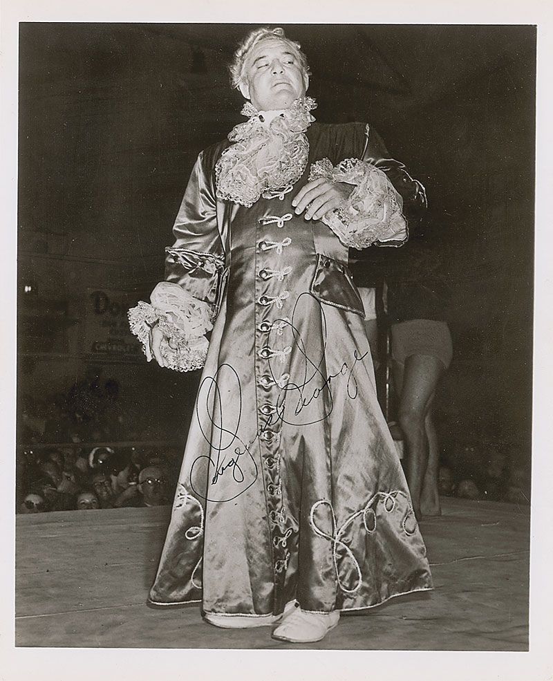 Professional wrestler (1915–1963) who gained mainstream popularity and became one of the biggest stars of the Golden Age of Wrestling. Vintage glossy 8 x 10 photo of Gorgeous George in a flamboyant costume, signed in black ink. In fine condition, with trivial irregular ink adhesion.