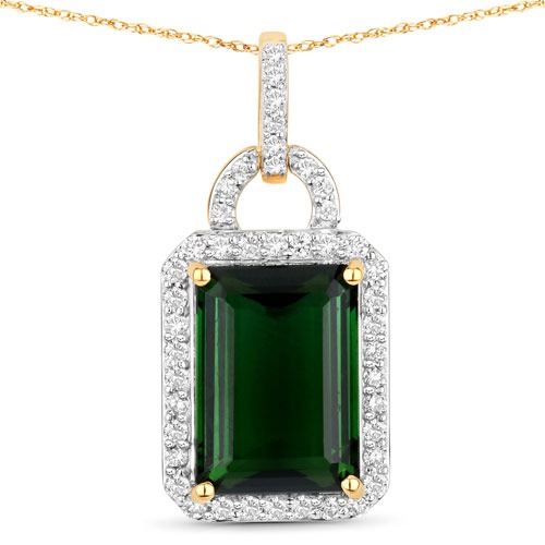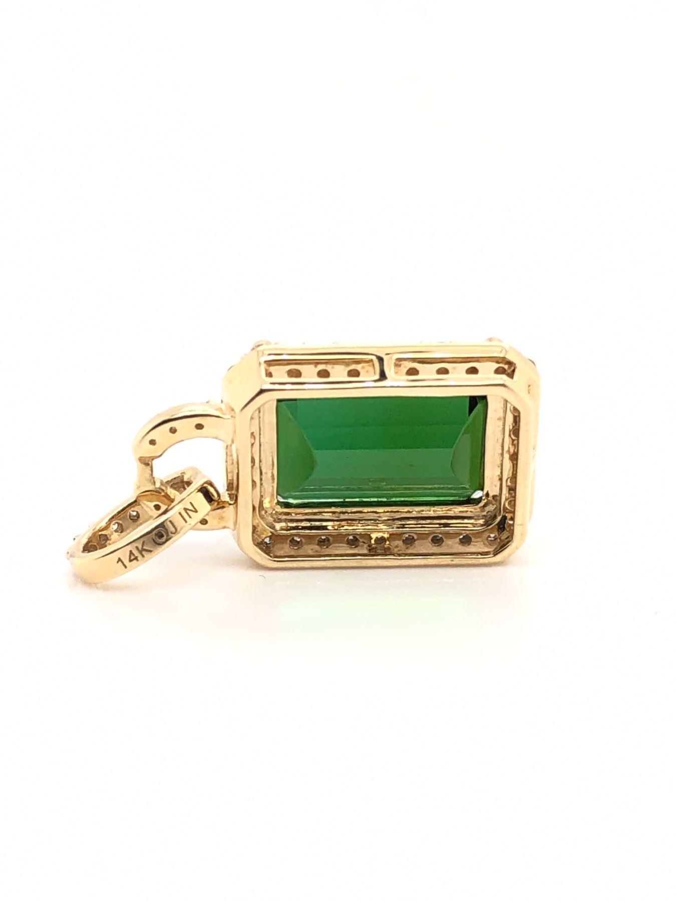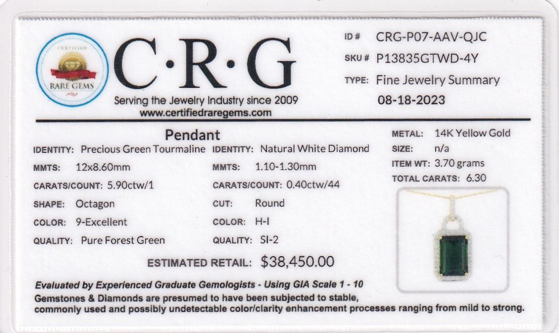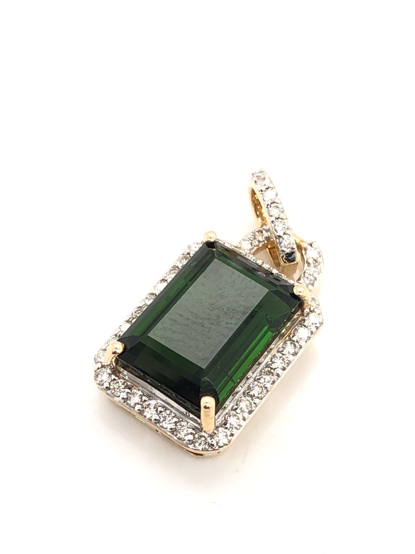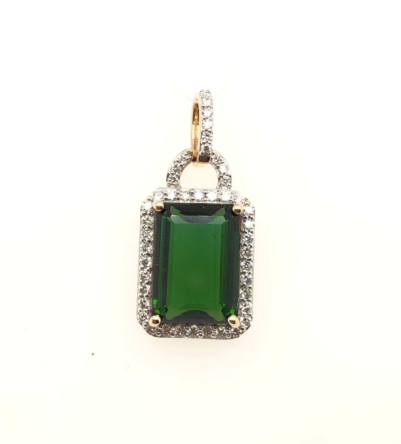 Genuine Tourmaline and Earth-Mined Diamond Pendant.& nbsp; Tourmaline is popular with jewelry designers due to the variety of deep, rich colors available.& nbsp; This green tourmaline pendant is a fine example!& nbsp; The 5.90 carat octagonal-cut green tourmaline is prong-set with .40 carats of round, brilliant-cut, H-I color, SI2 clarity diamonds in the halo, jump ring, and bail. The pendant measures approximately 5/8& quot; x 1/2& quot; and the bail can accommodate an approximate 3.25mm thick chain.& nbsp; This pendant is certified and appraised for $38,450.00 estimated retail replacement value. CHECK OUT THE MATCHING EARRINGS IN LOT 95!
