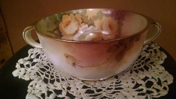 Gorgeous Hand painted two handle Nippon bowl with Blue **|**|** Beautiful Hand painted Nippon bowl with two handles trimmed in gold, yellow roses with burgundy undertones. Excellent condition. 3 1/2" tall, 3 " deep, 7" round. Maple leaf blue stamped.