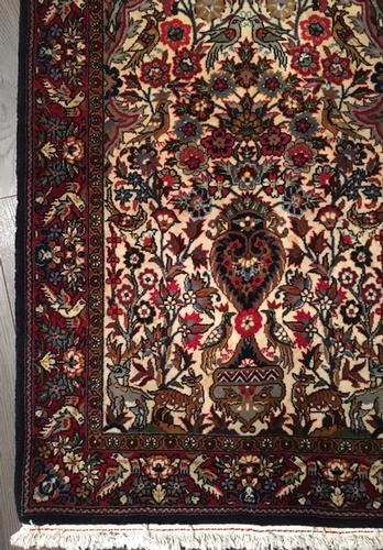 Made of fine quality, baby lamb's wool pile on cotton foundation, all natural vegetable dye, this authentic Persian Tabriz employs a lovely set of hybrid floral/wildlife motifs, from a finely detailed variety of bird species and deer. Encapsulated by a symmetrical border which utilizes a beautiful blend of floral and wildlife(bird) motifs. Hand woven in Tabriz, Iran, this wonderful rug is inspired from the various forests located around the city of Tabriz, with the type of flowers and wildlife which inhabit such forests. Size: 3 feet 8 inches X 2 feet 4 inches. Country of Origin: Iran.