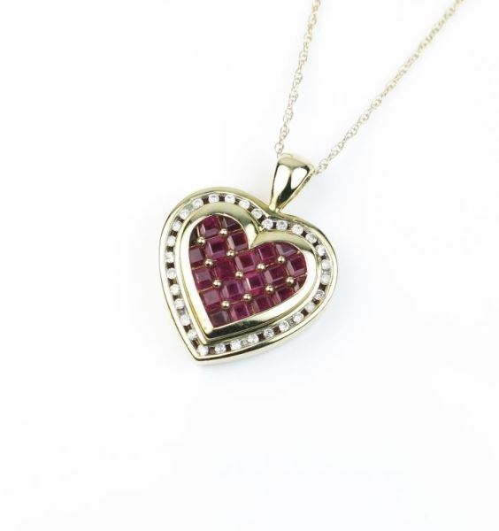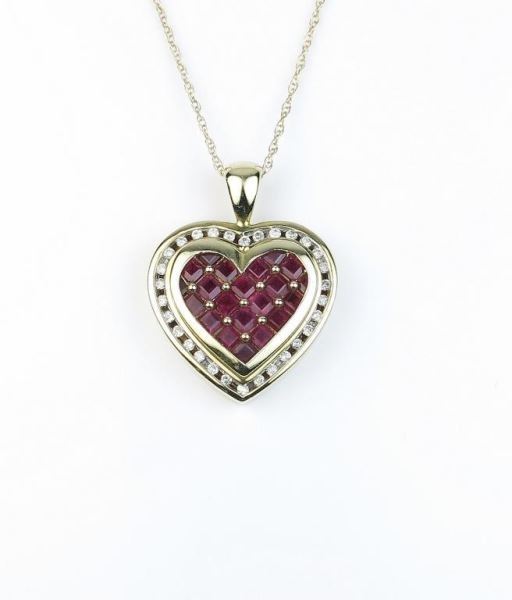 Pendant beautifully made piece featuring 21 invisible set rubies and 30 channel set diamonds with approx. 3.00 combined gem weight set in 14K yellow gold.