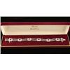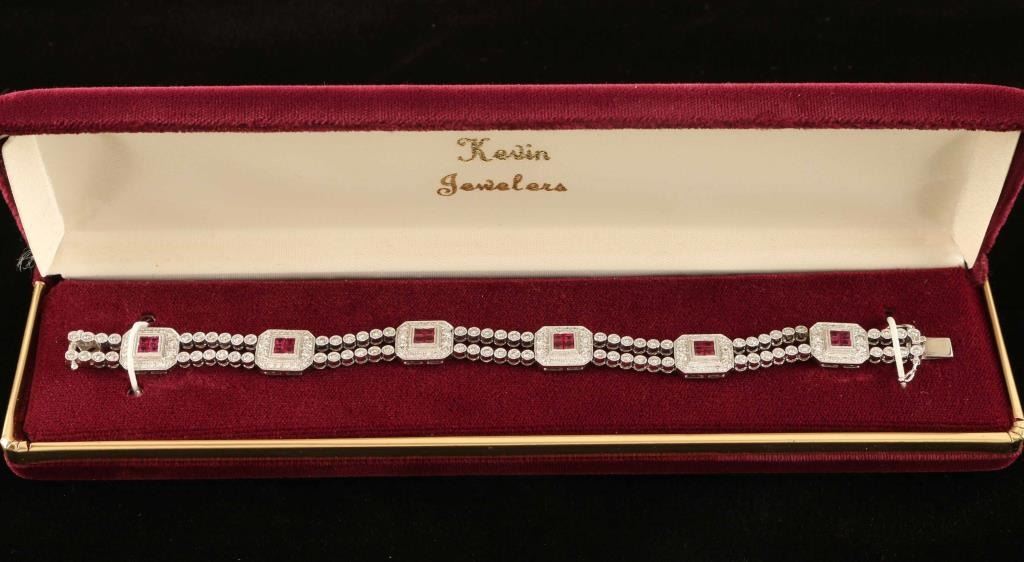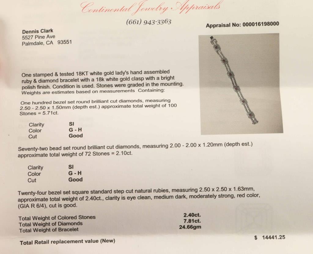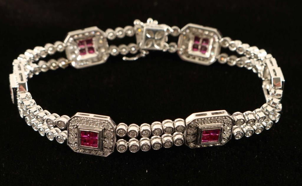 18 Kt white gold bracelet, with 100 bezel set round brilliant cut diamonds clarity SI color G-H with 72 bead set diamonds also with 24 bezel set square natural rubies includes professional appraisal by Continental Jewelry appraisals. States all facts enclosed in description Total replacement value $14,441.25