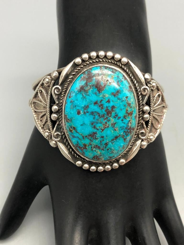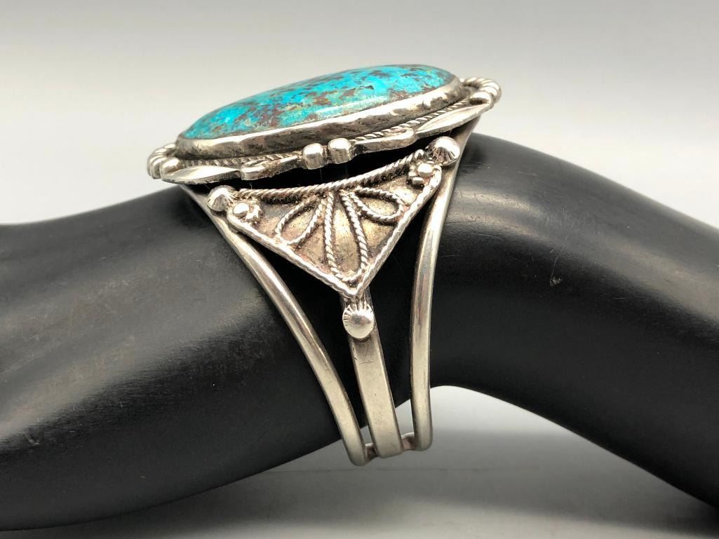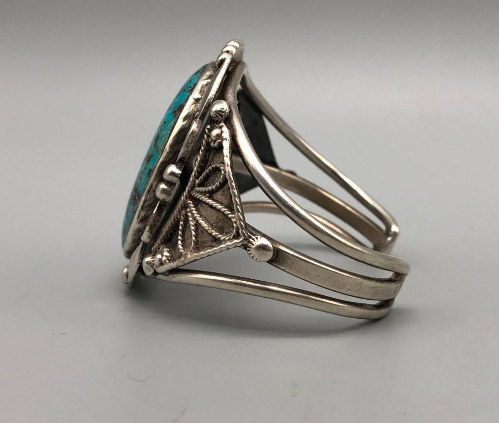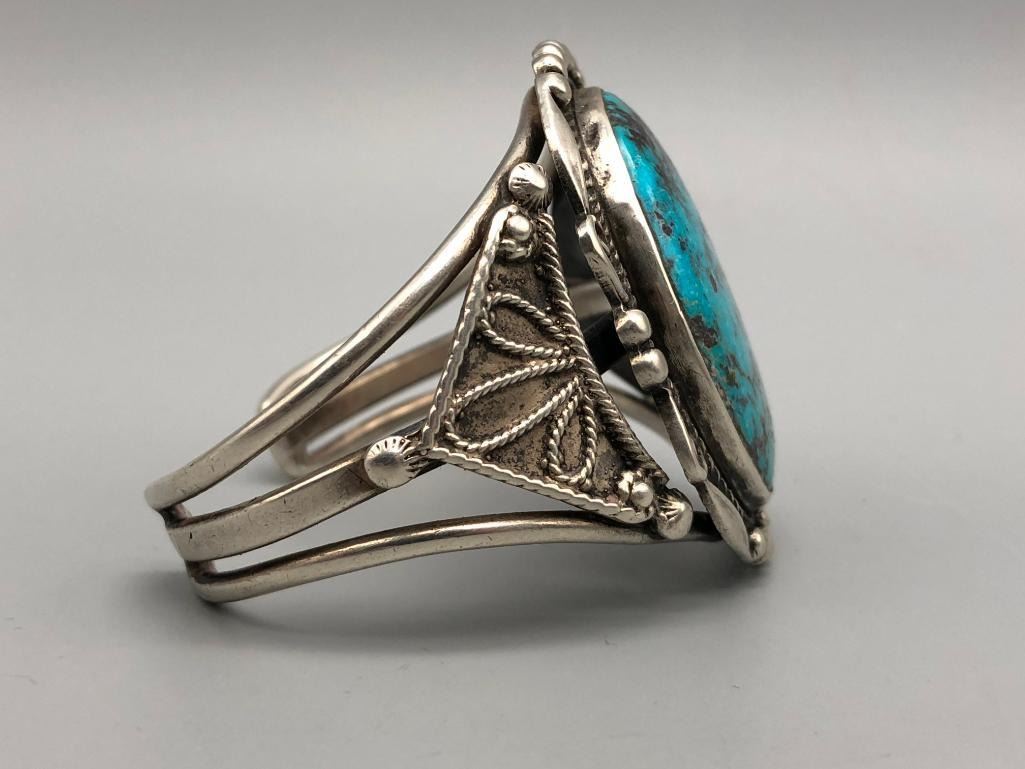 For sale in this lot is a gorgeous, large turquoise stone bracelet. It is set with a large, drool worthy turquoise cabochon. This is an elegant bracelet with fine twisted wire accents, silver dots and other silverwork, that give it a classy finish. It is on a three wire cuff and is made from sterling silver. MAKER: Unmarked. APPROX AGE: Vintage. SIZE: Inside circumference measures 5-1/4 inches long. Opening is an additional 1-1/8 inches, fitting a 6-3/8 inch wrist. Width is 2 inches. Weighs 63.1 grams. CONDITION: Good for its age, normal wear expected. Please look closely at the pictures as they are an important part of our description and are hereby incorporated into the description, specifically with regards to condition. SHIPPING: There will be a $5 handling / packaging fee for shipping this lot. The actual cost of postage will be added on top of that. BUY IT NOW: If you would like to buy this item now, without waiting for the auction day to bid on it, we do offer this option (which is available up to 48 hours before the actual auction starts). The “Buy it Now†price is the high estimate of this lot (plus applicable fees and the Buyer's premium is discounted to 10% when using the Buy it Now option). If you would like to exercise this option, you must contact us by email (or phone as long as you talk to someone live). Reference this lot number and your intention to "Buy it Now."