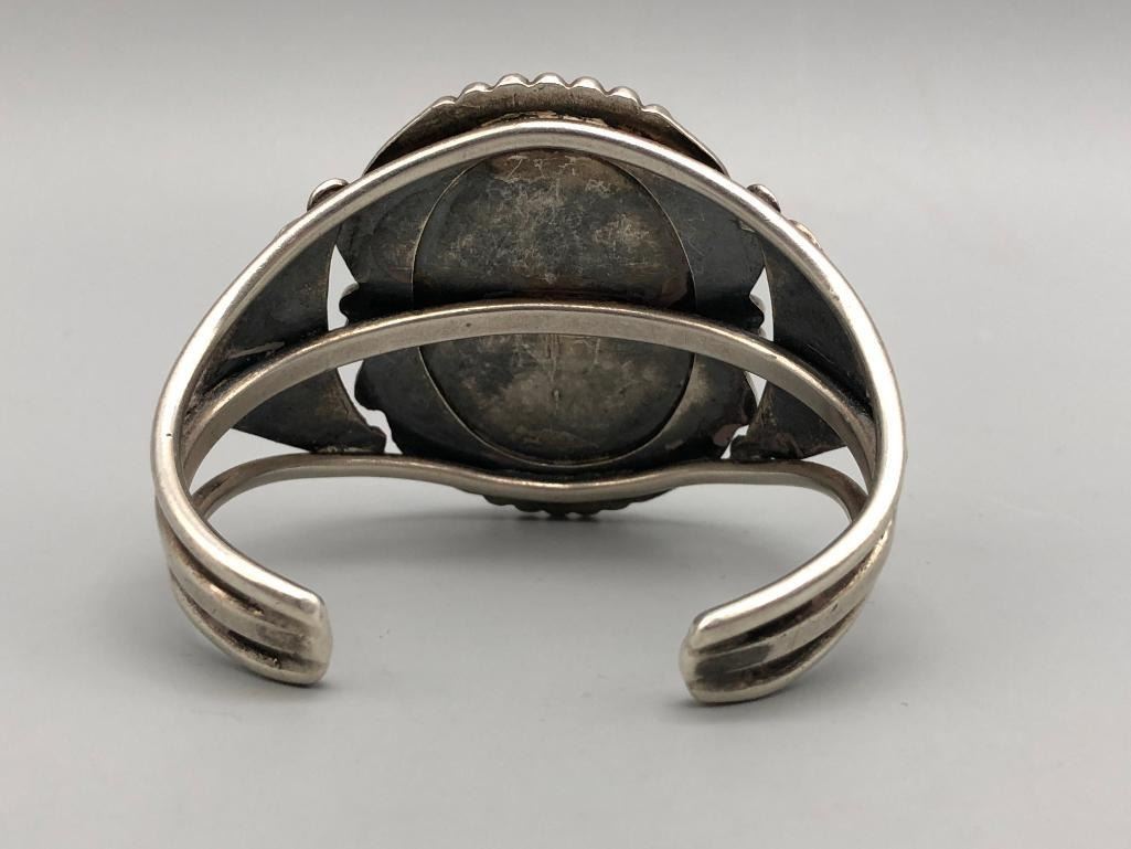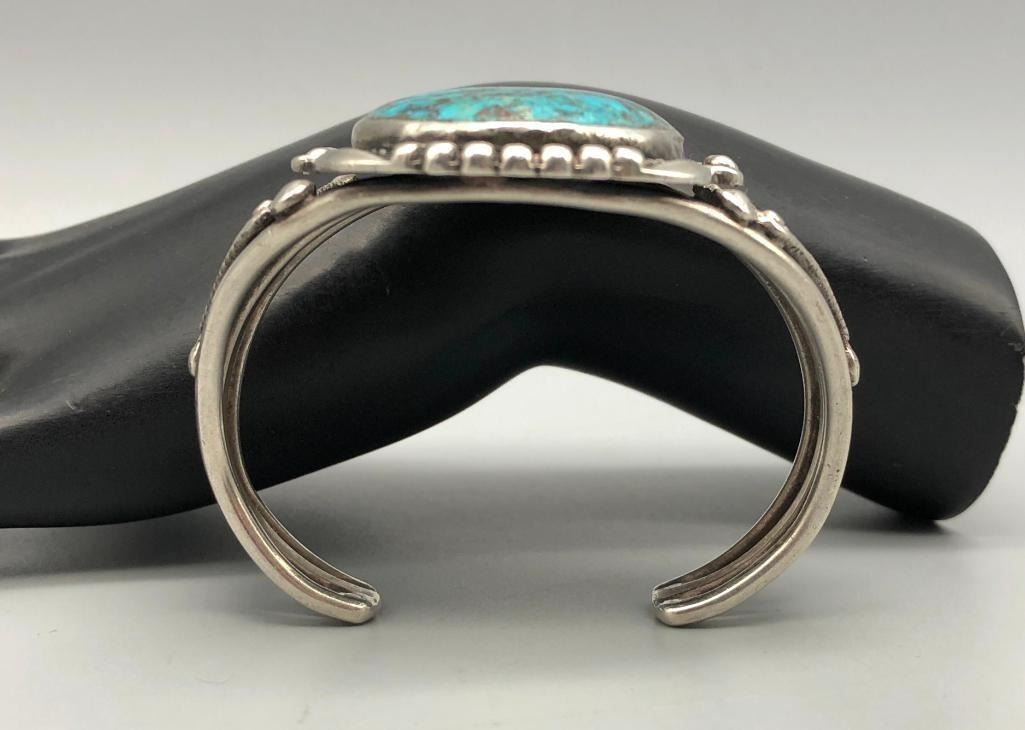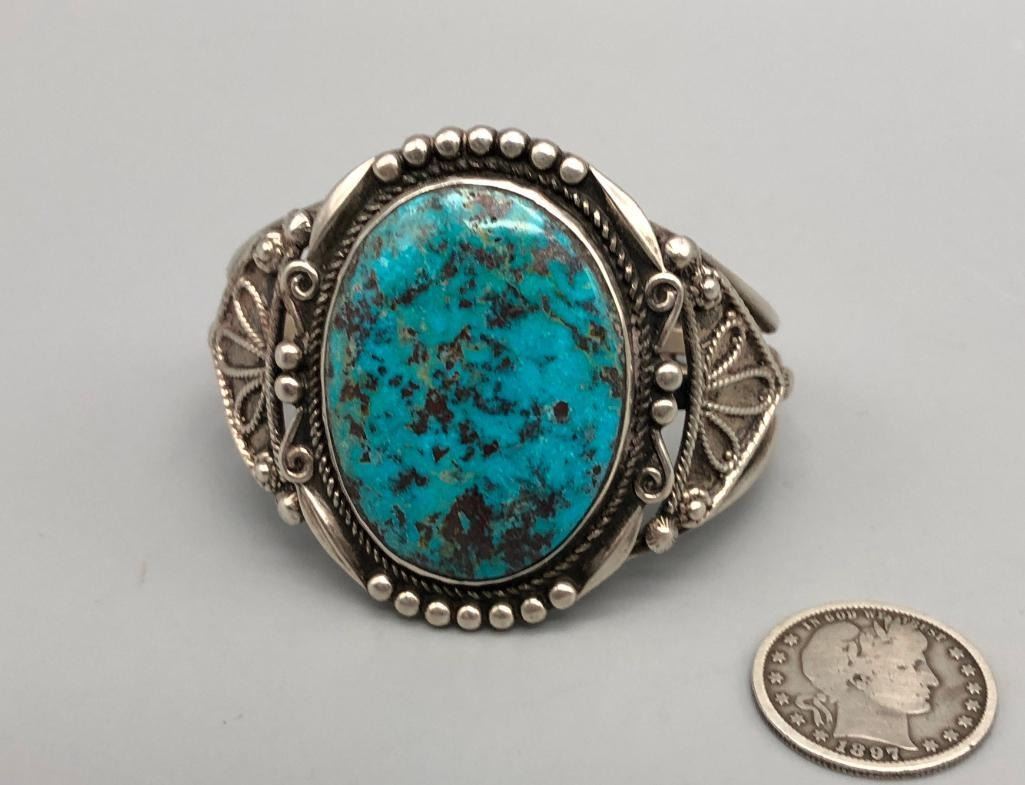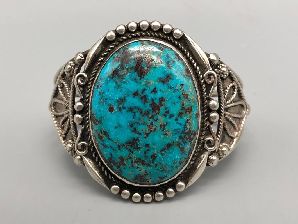 For sale in this lot is a gorgeous, large turquoise stone bracelet. It is set with a large, drool worthy turquoise cabochon. This is an elegant bracelet with fine twisted wire accents, silver dots and other silverwork, that give it a classy finish. It is on a three wire cuff and is made from sterling silver. MAKER: Unmarked. APPROX AGE: Vintage. SIZE: Inside circumference measures 5-1/4 inches long. Opening is an additional 1-1/8 inches, fitting a 6-3/8 inch wrist. Width is 2 inches. Weighs 63.1 grams. CONDITION: Good for its age, normal wear expected. Please look closely at the pictures as they are an important part of our description and are hereby incorporated into the description, specifically with regards to condition. SHIPPING: There will be a $5 handling / packaging fee for shipping this lot. The actual cost of postage will be added on top of that. BUY IT NOW: If you would like to buy this item now, without waiting for the auction day to bid on it, we do offer this option (which is available up to 48 hours before the actual auction starts). The “Buy it Now†price is the high estimate of this lot (plus applicable fees and the Buyer's premium is discounted to 10% when using the Buy it Now option). If you would like to exercise this option, you must contact us by email (or phone as long as you talk to someone live). Reference this lot number and your intention to "Buy it Now."