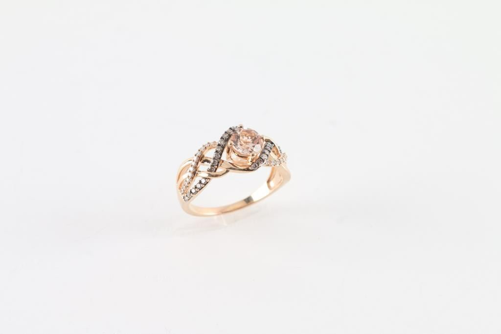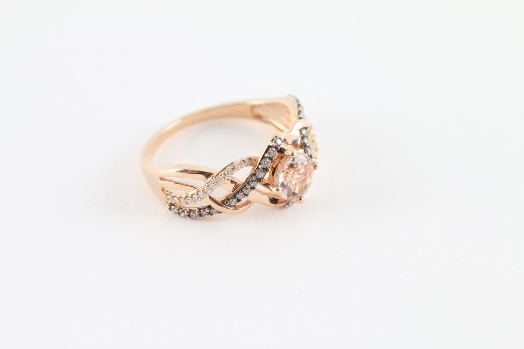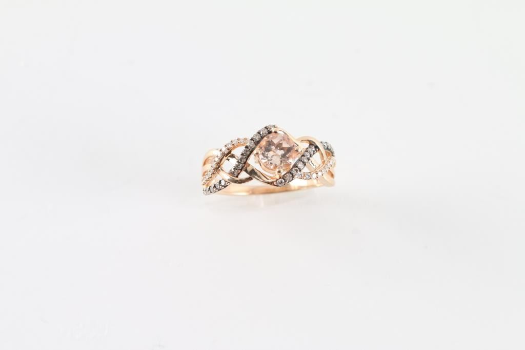 Featuring a center morganite with side white and champagne cut diamonds set in 14KT Rose gold, with custom setting size 8.5".