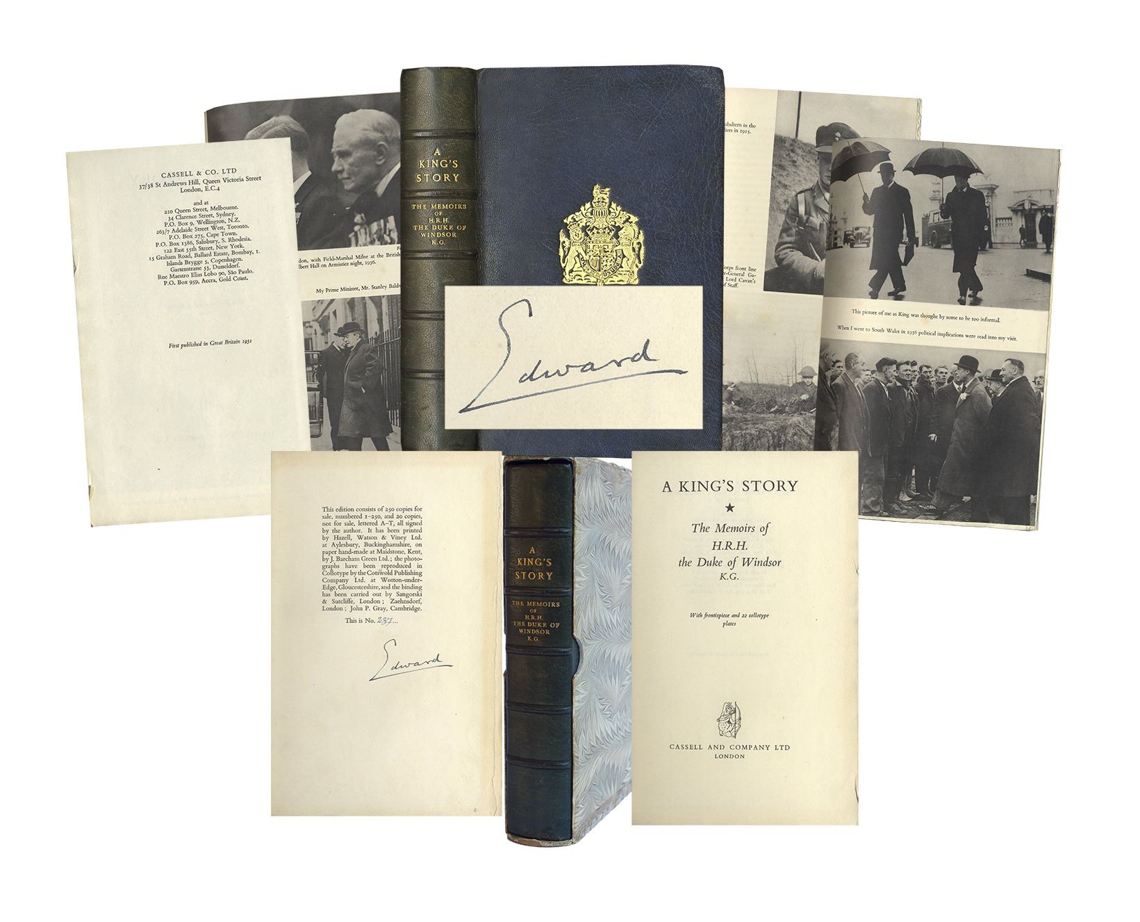 ''A King's Story'' limited edition, signed by its author, His Royal Highness Edward, the Duke of Windsor. London: Cassell, 1951. Volume is bound in publisher's teal morocco leather with gilt lettering to spine, gilt armorial coat of arms to front, five raised bands, and top edge gilt. This opulent teal morocco is much more rare than the rust morocco leather, also issued by the publisher. Signed ''Edward'' on the limitation page, this copy is #237 of 270 in the limited edition. Dedicated to Wallis Simpson, for whom he abdicated the throne, Edward's autobiography recounts his life as the ''Little Prince'' up until his abdication, with reflections upon the grave responsibility of King. Book is profusely illustrated with photographs of Edward's life, including a tissued frontispiece. Measures 6'' x 9.25''. Housed in original marbled slipcase, cracked along top edge and with glue residue along edges. Minute sunning to spine and light toning to book, otherwise a near fine copy.