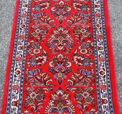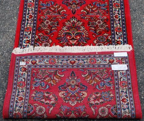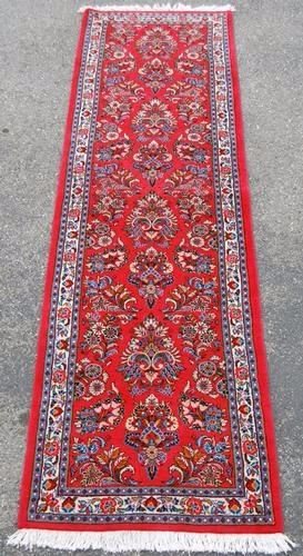 Absolutely lovely floral design Persian Sarouk runner. Made of fine quality lamb's wool pile on cotton foundation, all natural vegetable dye, incorporating a very lovely allover floral pattern on a rich red background and framed beautifully by an intricately done floral border. Hand woven in Sarouk, Iran.