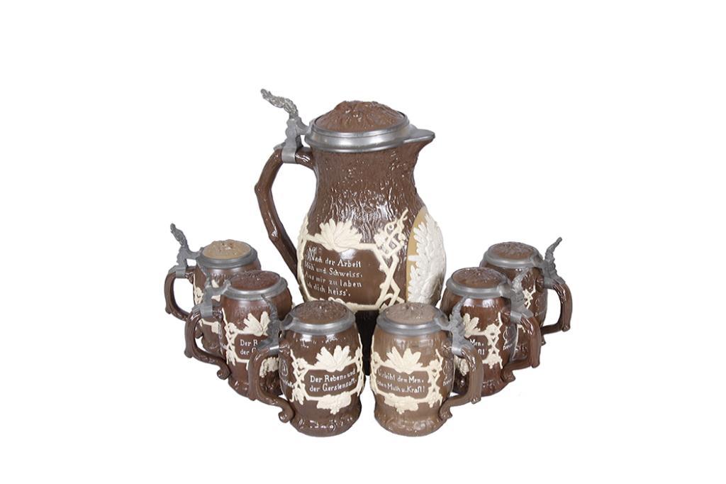 Gorgeous Metlach Pitcher #1028 3.0 liters with six matching .5L #1028 steins, in overall excellent condition.3.0 liters with six matching .5L #1028 steins, in overall excellent condition.