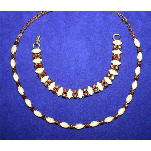 A fabulous vintage Rhinestone and Moonstone Necklace and Bracelet set created in the 1940s. Lots and lots of pretties! Prong set Navette Moonstones alternating with sparkling Root Beer colored Chaton Rhinestones make up this fabulous Necklace which measures 15 ½ inches long including the Rhinestone extender; securing with a C catch closure.. The matching Bracelet repeats the same pattern as the Necklace measuring 7 inches long and ½ of an inch wide, securing with a fold-over clasp. All stones are prong set in a closed back gold plated setting. Unique and beautiful!