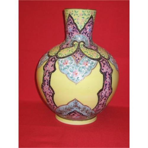 We are offering this gorgeous Opaline glass vase with raised Enamel painting. It is in very good condition( just small enamel wear on the rim) . The background is yellow and is divided in four part by column shape painting and there are designes on top and the neck and around the base.