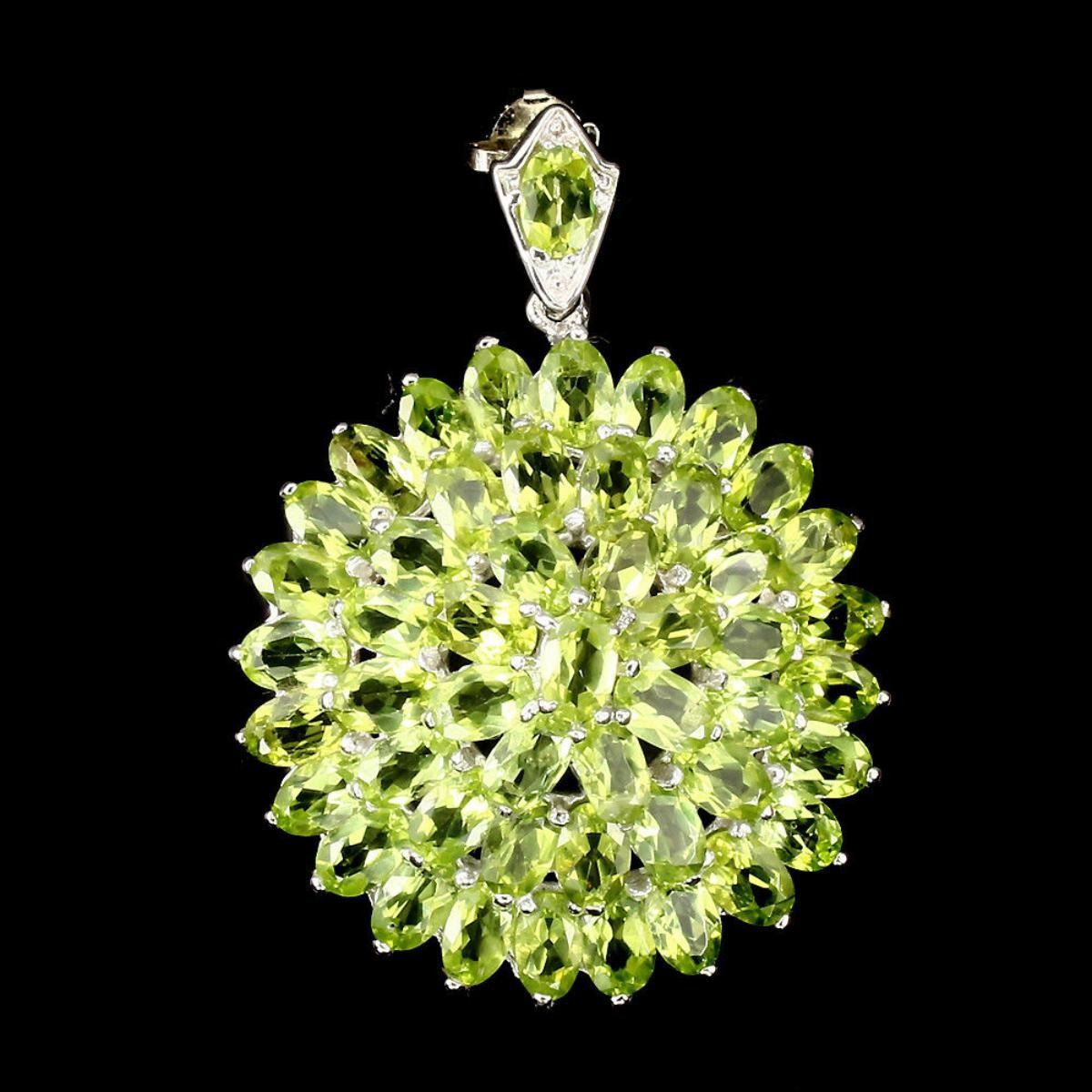 925 STERLING SILVER;PLATE....14K WHITE GOLD;MAIN STONEPERIDOT;OTHER GEMSTOTAL WEIGHT77.13 CT (TOTAL WEIGHT OF SILVER + STONE)DIMENSION* STONE 6.0 X 4.0 MM. * FACE PENDANT 50.0 X 37.0 MM.MAIN STONE SHAPEOVAL CUTMAIN STONE COLORTOP RICH GREENCLARITY/GRADEIF TO VVSLUSTERGORGEOUSTREATMENTUNHEATEDORIGINPAKISTANHARDNESS6.5 - 7.0