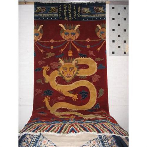 The collection we introduce to you is a exquisite pure wool rug with beautiful dragon pattern handmade in Tibet.Rugs and carpets are basic necessities in the Tibetan daily life.The high quality hand spun,vegetable dyed look,and the primitive but highly stylized patterns greatly appealed to westerners.Typically made for use as mats to sit on or for meditation,door and window covers,horse saddles,bed covers and pillar wrapping,the traditional Tibetan weaving generally reflect traditional Tibetan culture and religion.However,Chinese designs were also dominant as seen in the display of dragons,phoenix,clouds, floral and lotus images.