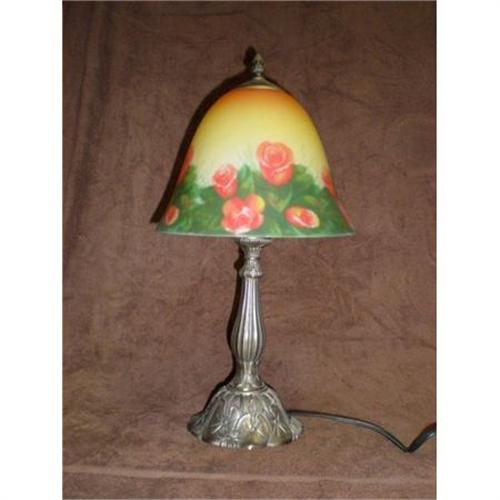 Gorgeous Reverse Painted Lamp. It measures 19" tall by 10" wide. Gorgeous reverse painting on shade of roses. Excellent table lamp. Lights up beautifully. You wont be disappointed with this one.