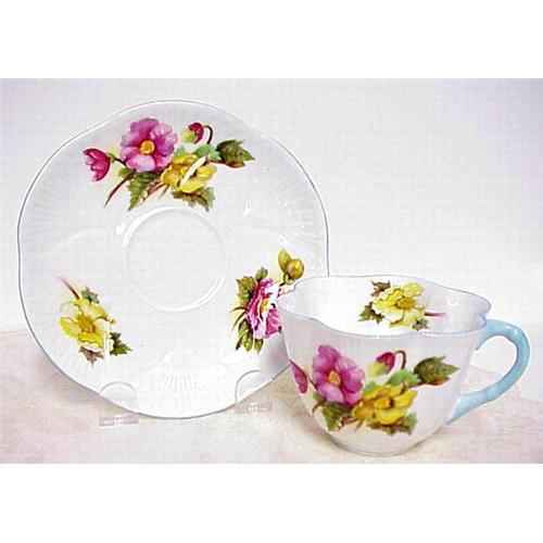 Oh so beautiful - And hard to find - The prettiest of the delicate china made by Shelley - England - And titled "Begonia" - Ptn no 13427 - Gorgeous pastel blue hand painted handle - Please take a look at the "dimpled" shape of the saucer and raised pattern on the saucer