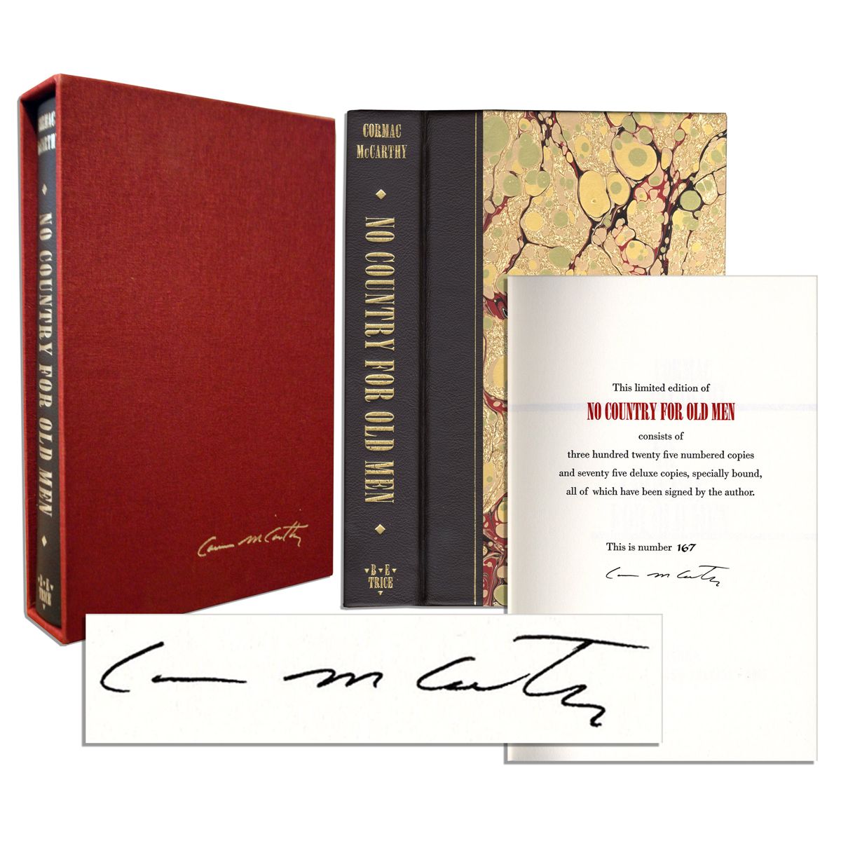 Pulitzer Prize-winning author Cormack McCarthy signed limited edition of ''No Country For Old Men'', B.E. Trice Publishing: New Orleans: 2005. Novel is number 167 of just 325 numbered copies in the limited edition, signed ''Cormack McCarthy'' in black ink on the limitation page. McCarthy's western genre tale revolving around stolen drug money in the 1970's was first written as a screenplay. Bound in marbled earth-tone paper boards, with chocolate endpapers and gilt-lettered leather spine. Housed in a crimson cloth slipcase. Runs 309pp. Measures 5.75'' x 8.75''. Fine.