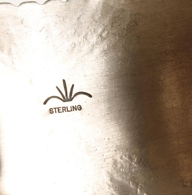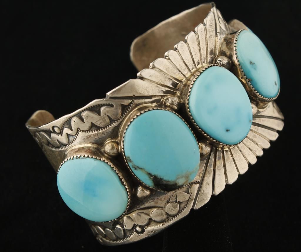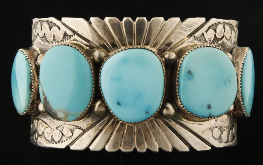 With (5) large turquoise nuggets that are all very consistent in color. Set in beautiful sterling silver. With silversmith hallmark of an Agave plant.