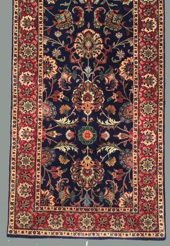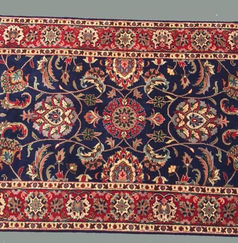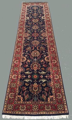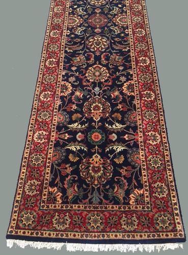 Gorgeous Super Quality handmade Silk Blend Persian-Pak Kashan Runner. Made of all natural, vegetable dye, pure silk blend with finest baby lambs wool pile on cotton foundation. This is a traditional Shah-Abbasi floral design on a rich navy blue color background with silk highlights. Notice the crisp and well defined curve-linear design which is a testimonial to the fine weave and the artistic workmanship. The silk highlights give this piece an added dimension. This lovely Runner is just a beautiful tapestry of colors. Where the average number of colors used in a Rug are between twelve and sixteen colors, this Rug features more than thirty five different colors, putting this piece over and above, the like of which is hard to come across in the market place. This is the crown jewel of royal Kashan, a true masterpiece. Condition is excellent. Size: 10 feet X 2 feet 7 inches. Country of Origin: Pakistan.