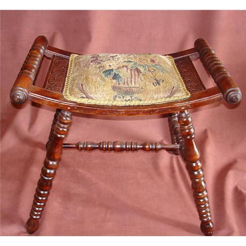 Absolutely Beautiful Victorian Vanity Bench from an Pennsylvania Estate. Charming Tapestry top with turned dark wood spindles, carved on top with a great design.