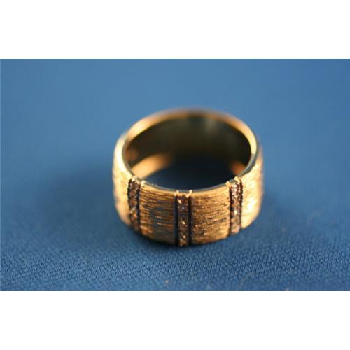 This striking band is detailed with deep florentine texture (about 1/2 inch on the back of the shank is left polished). It has 3 lines of 6 diamonds each, totaling .20 cts. This would make a lovely wedding band, anniversary ring or right hand ring. It weighs 3.2 grams and is a size 6.5 (sizable by me or by your jeweler).