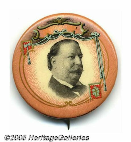 <B>Gorgeous and Rare 1 1/4" 1908 William Howard Taft Button by American Artworks</B></I> This Coshocton, Ohio company produced some of the most elegant multi-color designs of the 1908 and 1912 campaigns. Clearly their buttons were issued in limited numbers, for all varieties are rare. Great condition. Lot:261