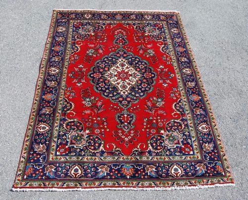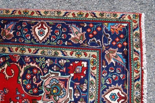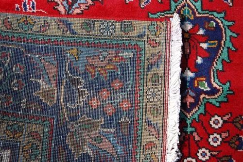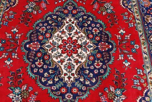 Beautifully fine quality Tabriz design Rug. Made of fine quality wool pile on cotton foundation, all natural vegetable dye, incorporating a finely detailed floral pattern on a rich red background; large teardrop central medallion; crowned corners and finished off beautifully with an intricately detailed floral border. Size: 6 feet 6 inches X 9 feet 8 inches. A very finely contrasted Rug.