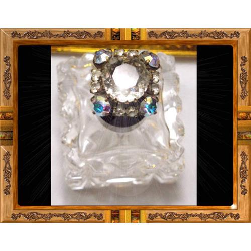 This is a piece, that when you hold it in your hands you appreciate the quality and design of the thick cut glass that makes up this wonderful piece. The huge rhinestone center stone on the top is surrounded with glass aurora borealis stones. The height on this is 3 1/3? and it is 2? wide. SOLID and it shines like diamonds when the light hits it.