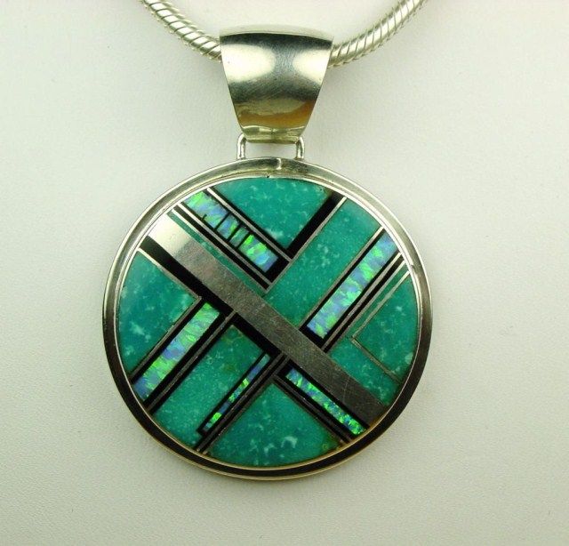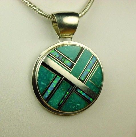Gorgeous ladies Sterling Silver neckpiece ‘Made in Italy’ set with fine created Opal, Turquoise and black jade inlay weighing 70 grams. Estimate $400-$600 Labor intensive.