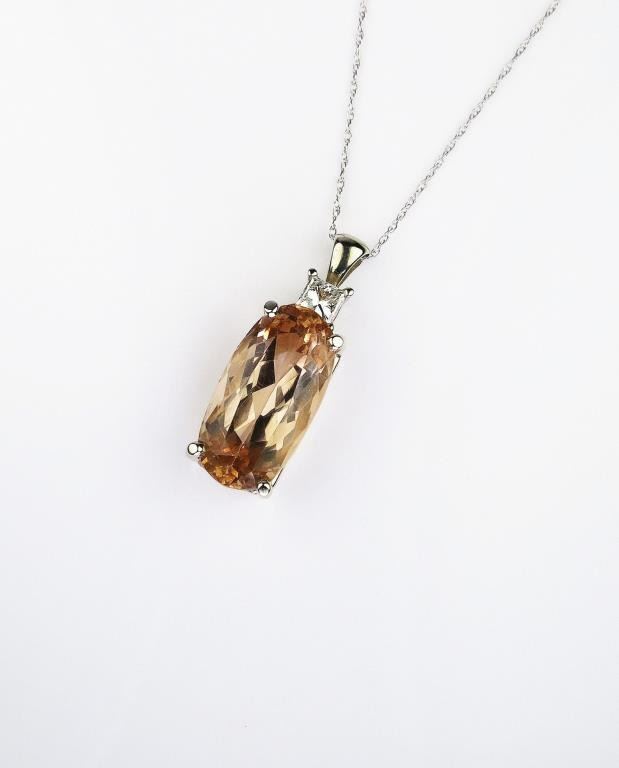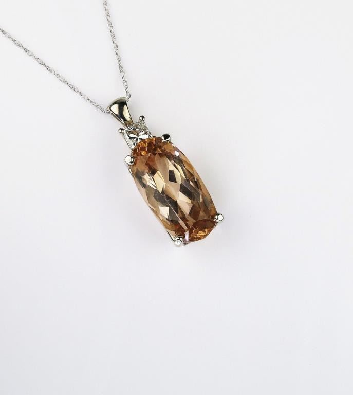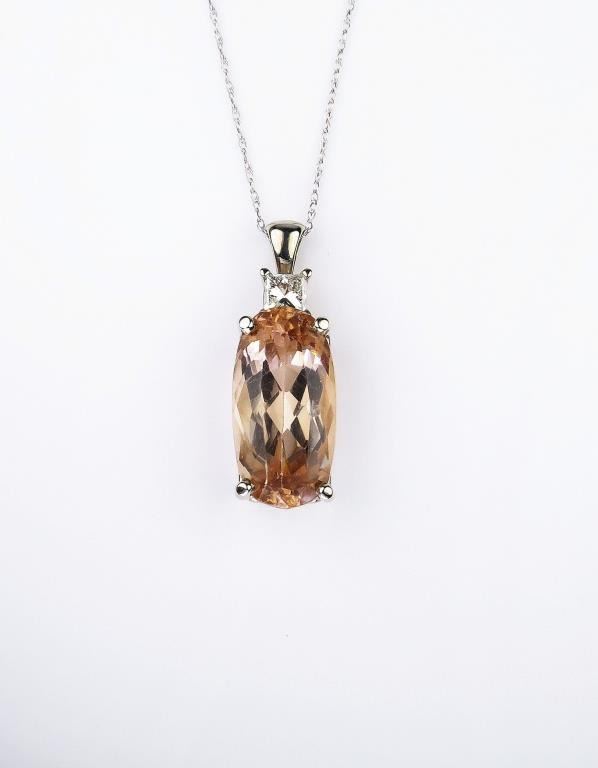 Gorgeous ladies neckpiece set with a Precious topaz weighing 13.18 carats of peach color accented with a princess cut diamond weighing approx. 0.45 carats of F-G color set in a 14 karat white gold custom made setting. Retail$3,000-$4,000 Estimates $1,500- $2,000