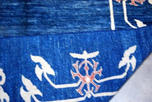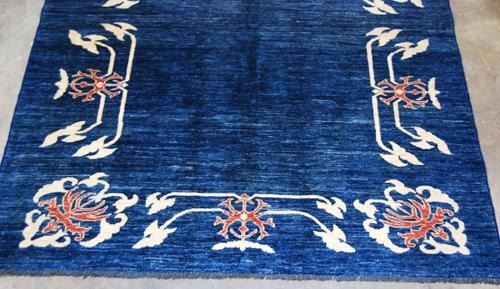 Gorgeous open field ocean blue Rug. Made of fine quality lamb's wool pile on cotton foundation, all natural vegetable dye, this beuatiful Rug employs an open field design on a deep blue sea background and encaspulated beautifully by a delicately done border. Hand woven in Tibet. Size 7 feet 1 inch X 6 feet 5 inches.