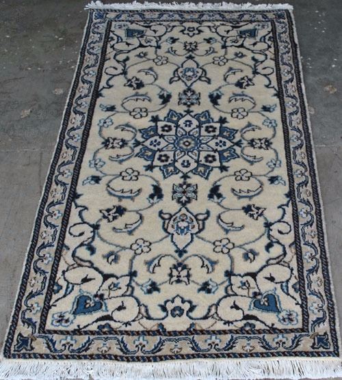 Gorgeously designed fine quality Nain. Made of 100% baby lamb's wool part silk on cotton foundation. Handmade vegetable dye Rug from City of Nain. Country of origin: Iran. Size: 4 feet 4 inches X 2 feet 2 inches.