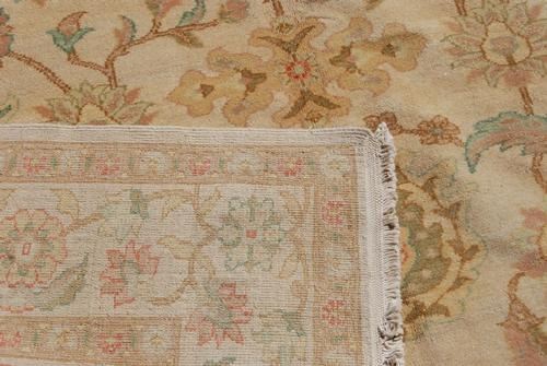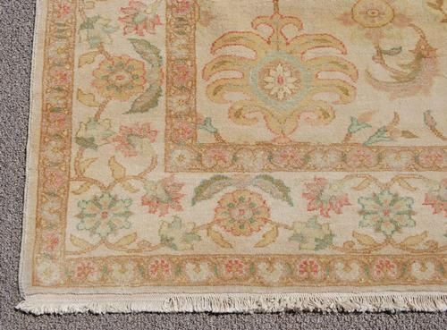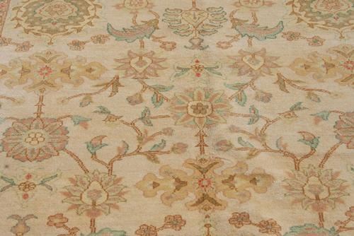 Nicely contrasted Egyptian rug. Size 6.4 x 8.9 feet, made of fine quality lamb's wool pile on cotton foundation, all natural vegetable dye, this beautiful rug incorporates a set of large floral patterns on a ivory background. With very rare and nicely defined colors, and encapsulated by an intricately done floral border. Hand woven in Egypt.