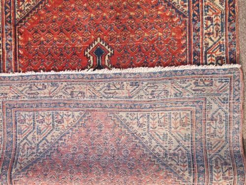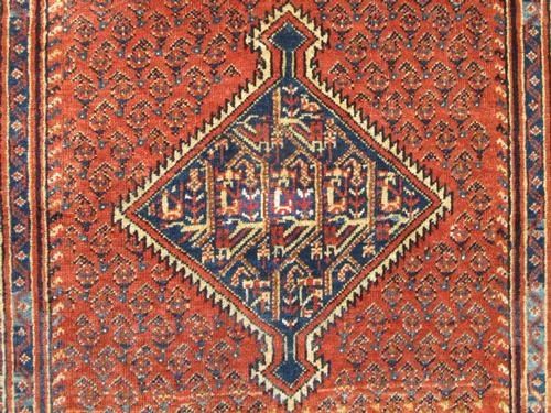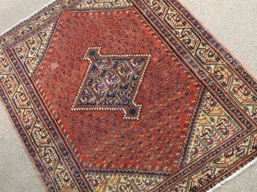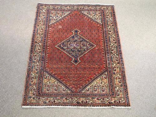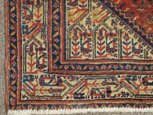 Rug: Handmade Semi Antique Persian Sarouk Mir; Material: Fine quality baby lamb's wool pile, all natural vegetable dye; Size: 5.1 x 3.6 feet; Foundation: Cotton; Design: Persian Sarouk Mir; Origin: Iran