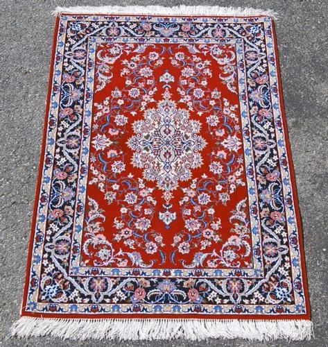 Gorgeously designed Persian Isfahan with silk. Made of fine quality soft baby lamb's wool-part pure silk pile on cotton foundation, all natural vegetable dye, this strikingly gorgeous Rug is a fine example of the isfahan version of the regal shah abbasi floral pattern. with a mesmerizing and highly detailed centerpiece medallion, this wonderful rug is framed beautifully by an intricately done floral border. Hand woven by a master Persian carpet weaver in Isfahan, Iran. Size 3 feet 7 inches X 5 feet 3 inches.
