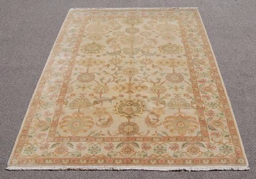 Nicely contrasted Egyptian Rug. Made of fine quality lamb's wool pile on cotton foundation. All natural vegetable dye, this beautiful Rug incorporates a set of large floral patterns on a ivory background. With very rare and nicely defined colors, and encapsulated by an intricately done floral border. Size: 6 feet 4 inches X 8 feet 9 inches. Hand woven in Egypt.