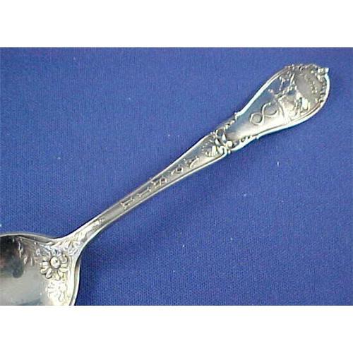 This lovely 6" long sterling silver spoon by Gorham is the Zodiac spoon for April. The front of the handle has Taurus the bull and says April. The flower of the month, the daisy, spills into the top of the bowl. The back is engraved with a fancy monogram. It is marked with H in a diamond meaning heavy weight silver. This spoon is in extremely good condition and will cost $4 to ship to US addresses.