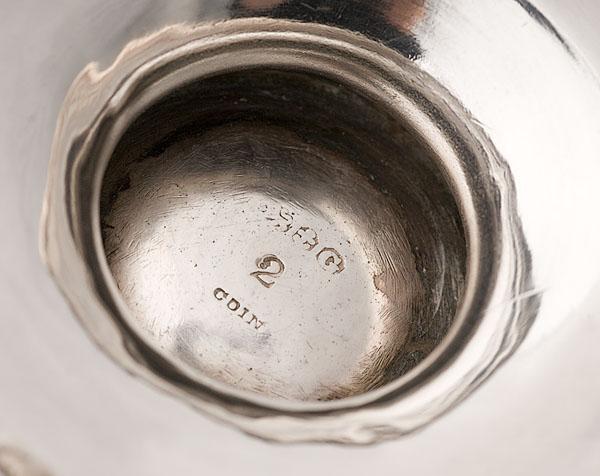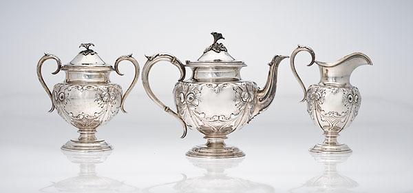 Providence, Rhode Island, ca 1855-60. Marked for the Gorham Silver Co., COIN with size designation numbers. Includes coffee pot, covered sugar bowl and creamer, all with chased and repoussé floral decoration and cast flower finials. Tea pot is 8.5" high x 10" spout to handle. No monograms. 37.648 ozt.