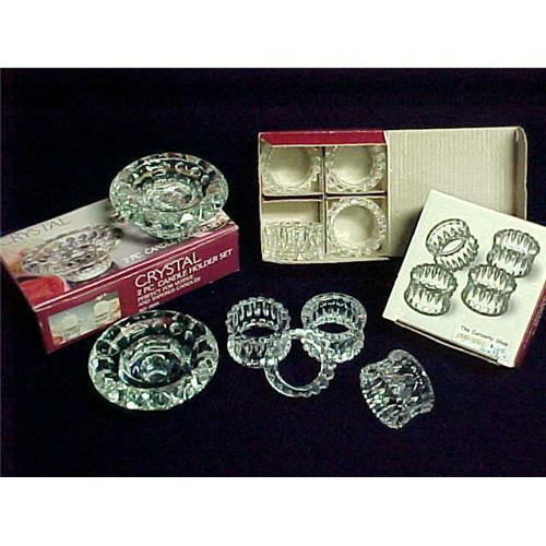 Gorham Crystal Napkin Rings and Crystal Candle Holder Set. Eight(8) Napkin Rings and a Pair of Crystal Candle Holders. All are New and In Box.