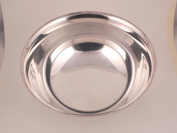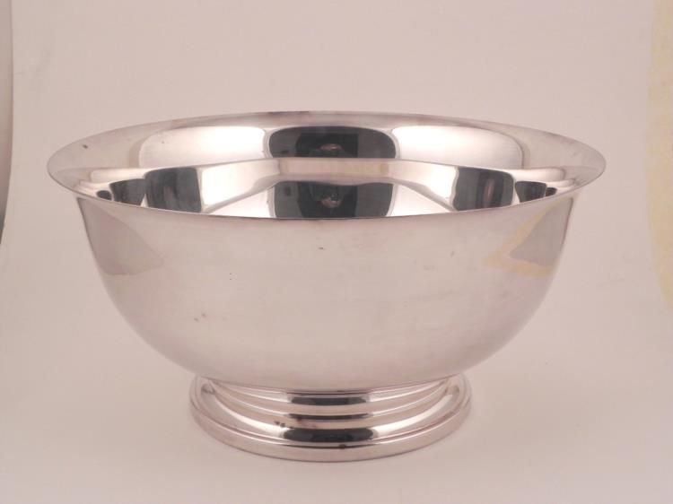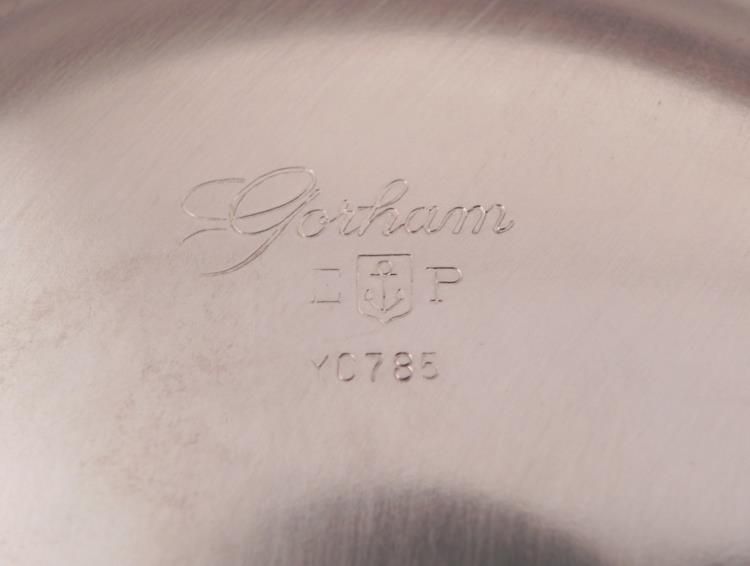 This large silver plated serving bowl from Gorham is in a traditonal style, with flared rim. The underside has the maker mark, and item number YC785. The diameter measures 12". The condition is very good, with normal use wear. * * This bowl will bring some silvery style to your table.