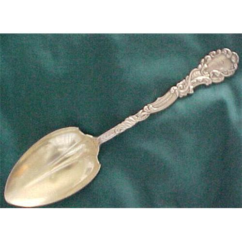 This is a huge, 8.75" long, sterling silver casserole serving spoon in a magnificent, ornate Victorian pattern, Marie Antoinette by Gorham. I love the pointed spade shape of the gold washed bowl! The front of this spoon is monogrammed E A L, and the back is engraved Lattimer. This spoon is in extremely good condition and will cost $6 to ship to US addresses.