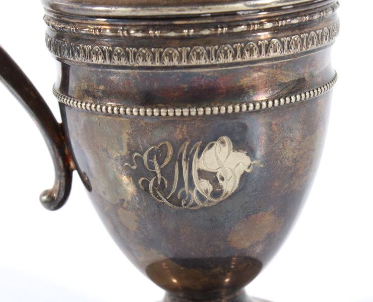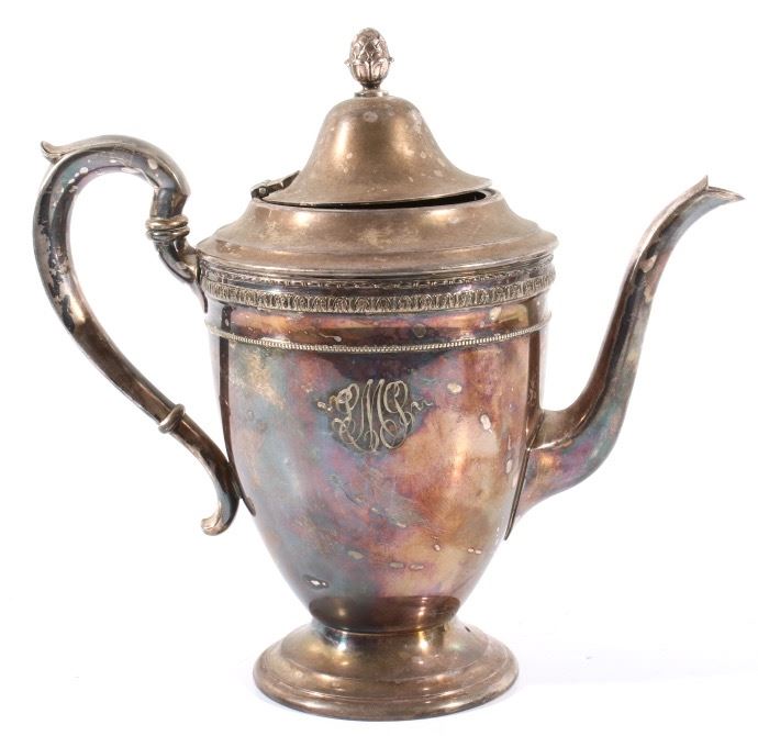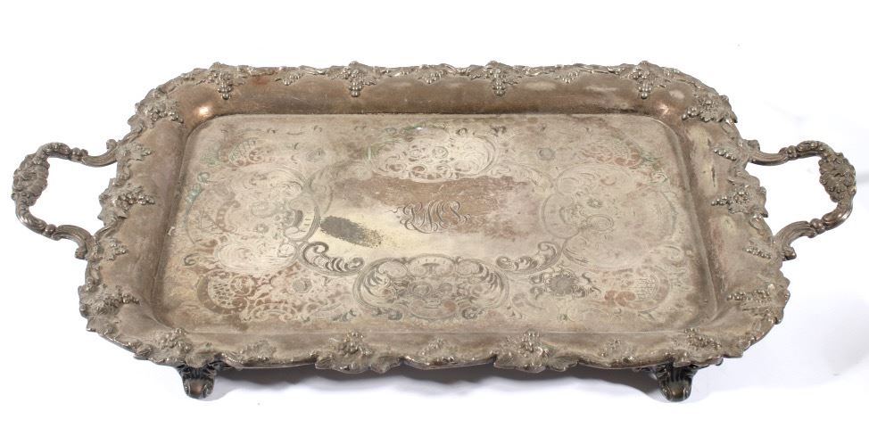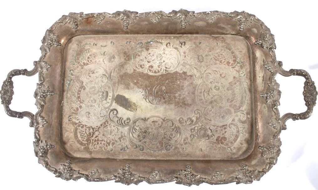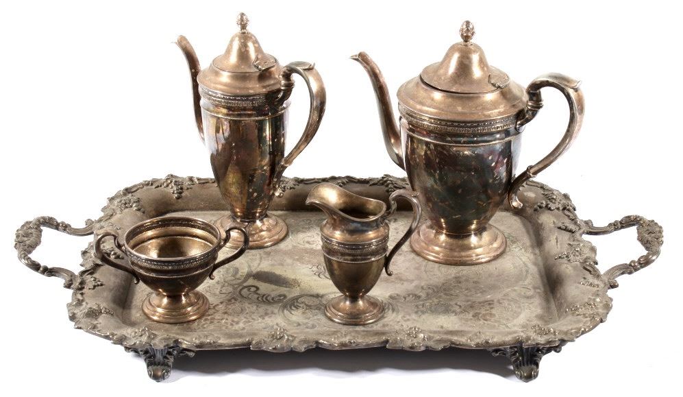 Featured in this lot we have a monogrammed Gorham silver tea and coffee set originating from 1928- 1929. The set includes a 2 7/8 pint coffee or tea pot, a 1 1/2 pint pot, a 6 oz creamer cup, a sugar bowl, and a silver serving tray. The collection is all marked with the monogram "LMP" in ornate lettering. The set shows wonderful craftsmanship with sturdy construction and patterned bands across the top. Each of the piece is marked across the bottom reading "Gorham E P 1 1/2 Pint" with some slight variation, along with an anchor symbol and year designator. The tray shows intricate etched designs and a embossed grape vine border. The set shows good condition overall with a warm patina across the pieces. The tray measures 25" wide by 14 1/4" deep and the largest pot measures 9 1/2" tall by 10" long with a diameter of 5 1/2".