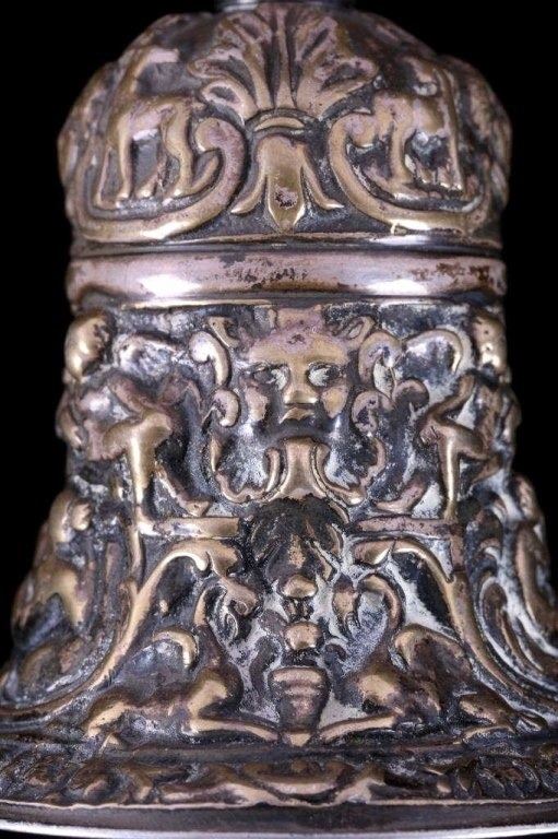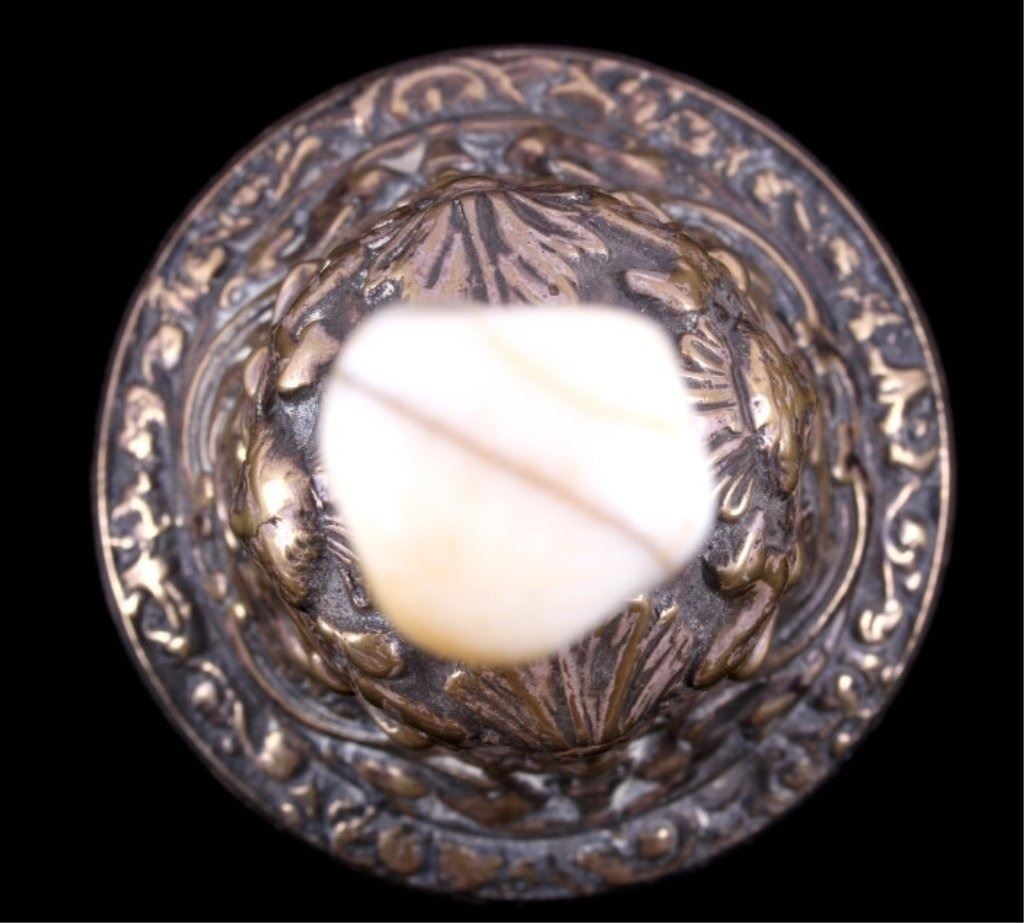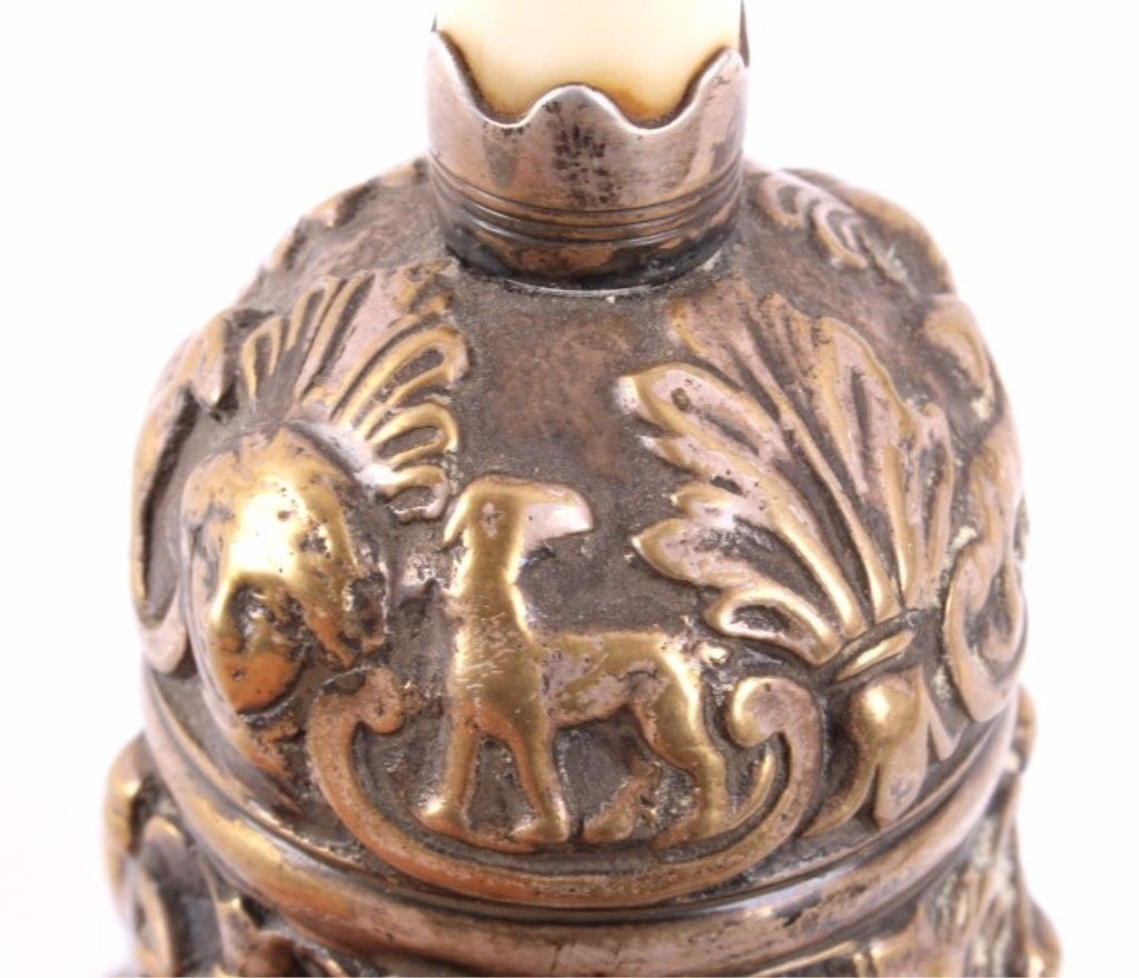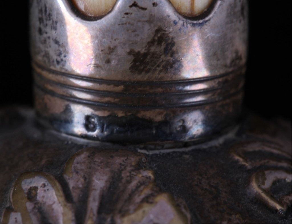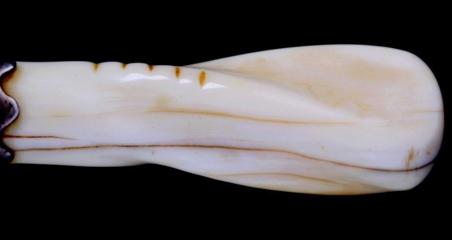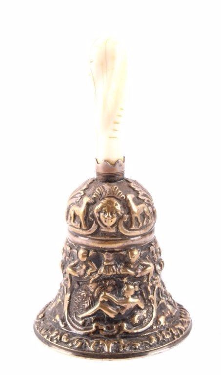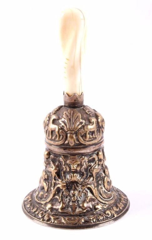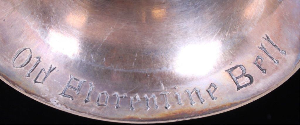 This is an excellent 19th century Gorham Old Florentine Bell with Ivory Handle and is marked, “Sterling” silver. The bell is from the 19th century and shows an exquisite design. Inside of bell marked, "(anchor symbol) Gorham Co. 042", "Old Florentine Bell". The bell is also marked, "Sterling" on the top strap around the handle (silver content amount of the bell and drop are unknown). Measures 5.25"t and 2 7/8" in diameter. This is an original made piece from a well-respected silver company. The ivory is from an Alaskan Walrus and was legally taken pre-1900. No returns will be accepted on this piece. Review Pictures for condition and description correctness. Buyer must rely on their own inspection and knowledge when bidding on this piece. Total weight .
