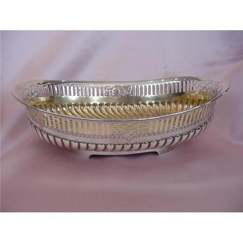 Rare and exquisite footed, fluted ,pierced, and engraved sterling Gorham bowl with gilded interior. The bowl measures 10 1/2" long, 7" wide, and 3 1/4" deep. This gorgeous bowl has it all, making a beautiful centerpiece.There is a monogram in the center of the bowl(see photo). The bottom is engraved 1898, but the marks indicate it was made in 1891. Marks include a lion, anchor, a "G", a lion head (1891), and "Sterling". Excellent condition.