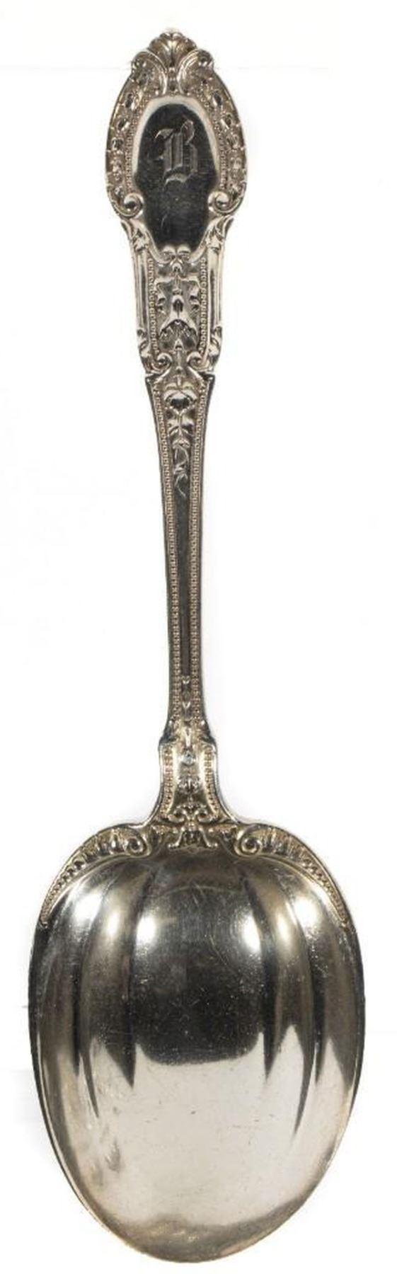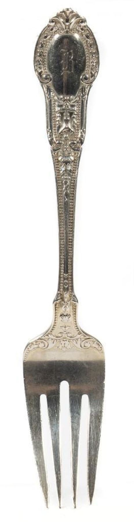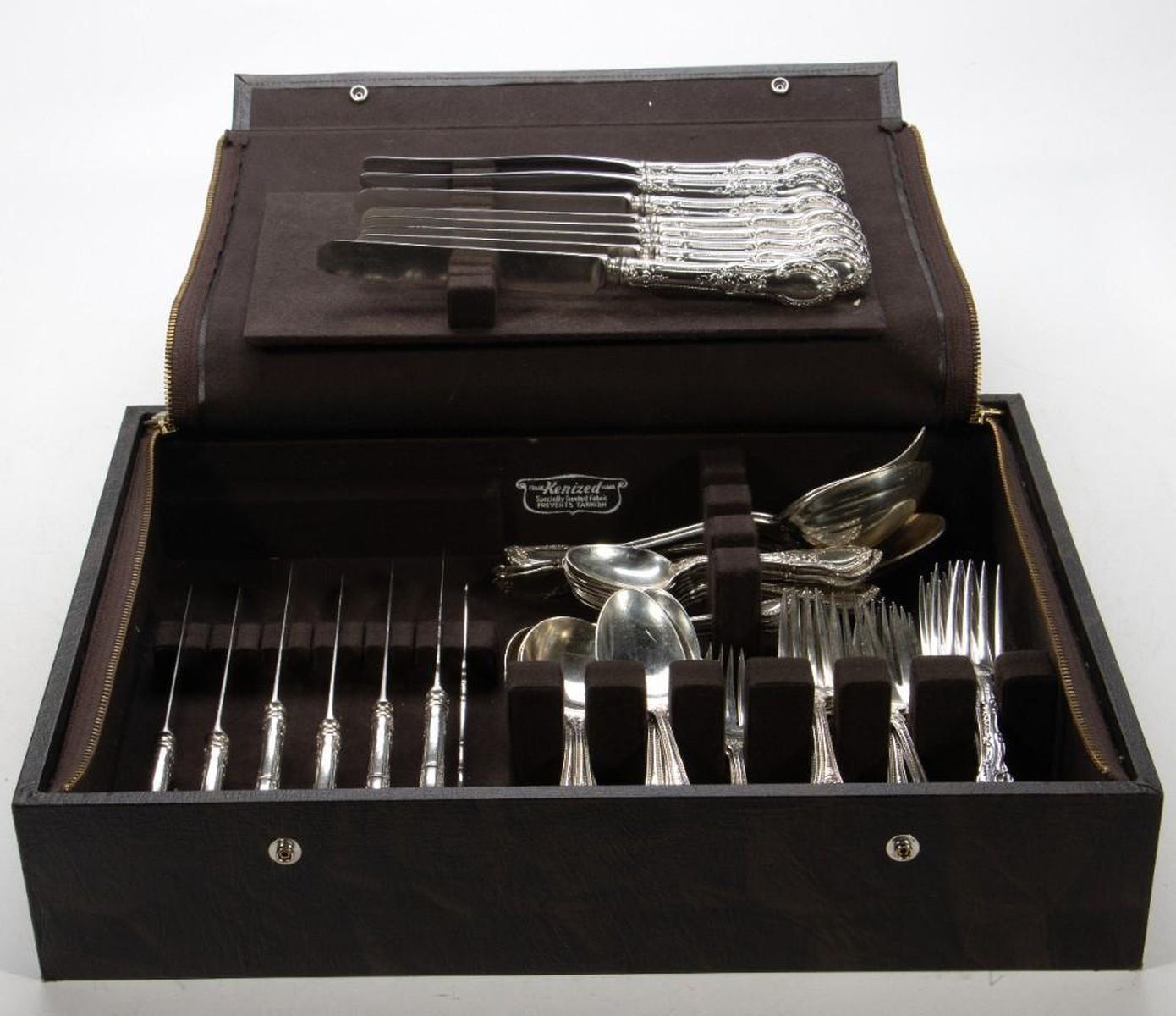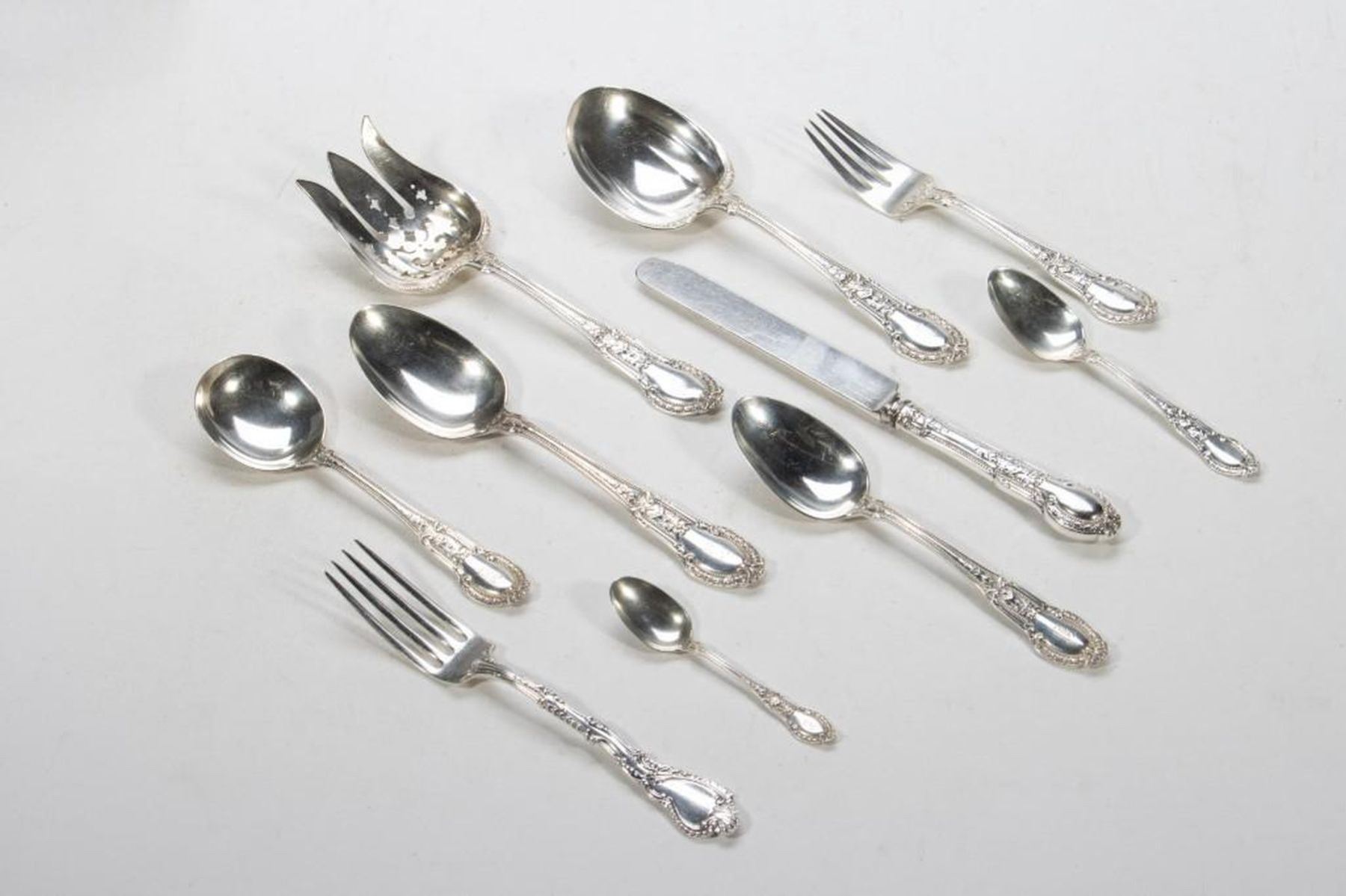 Tuileries Pattern. Set includes eight knives, nine dinner fork, seventeen salad fork, two dessert fork, eight soup spoon, six cream soup spoon, eight tea spoons, five demi-tasse and five serving pieces. (51 pieces) Some with monogram. 2789 grams excluding knives. Condition: Very good. Some monogrammed.