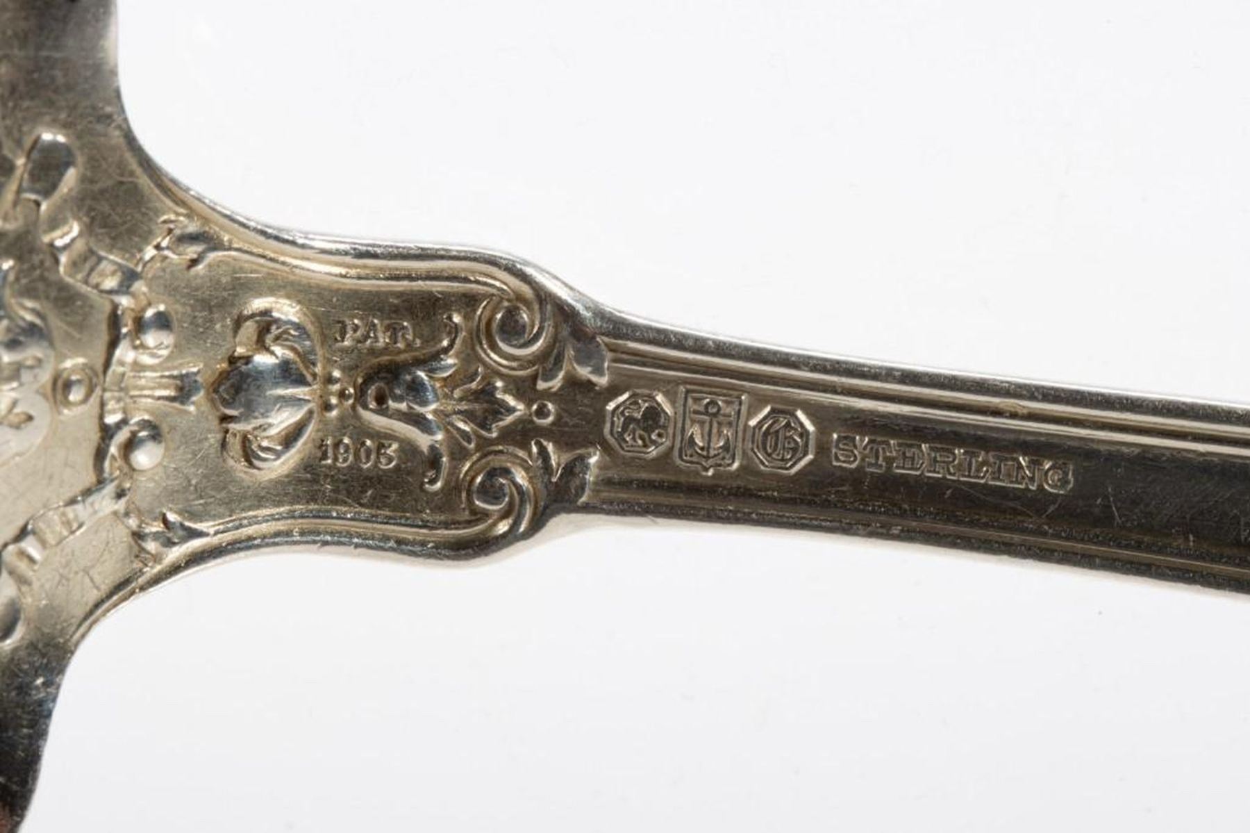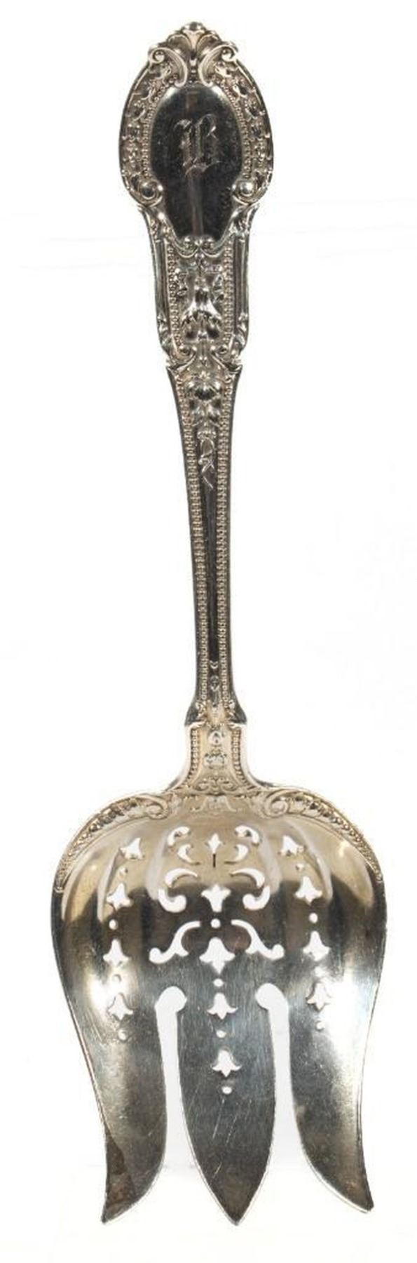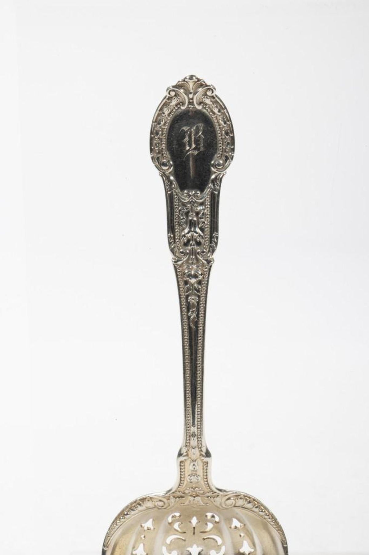 Tuileries Pattern. Set includes eight knives, nine dinner fork, seventeen salad fork, two dessert fork, eight soup spoon, six cream soup spoon, eight tea spoons, five demi-tasse and five serving pieces. (51 pieces) Some with monogram. 2789 grams excluding knives. Condition: Very good. Some monogrammed.