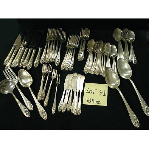 Gorham Sterling silver set 78.5 oz, Lilly of the Valley c1950. 8 dinner forks, 8 salad forks, 8 soup spoons, 18 tea spoons, 8 knives, 7 seafood forks, 8 butter knives and 6 serving pieces.